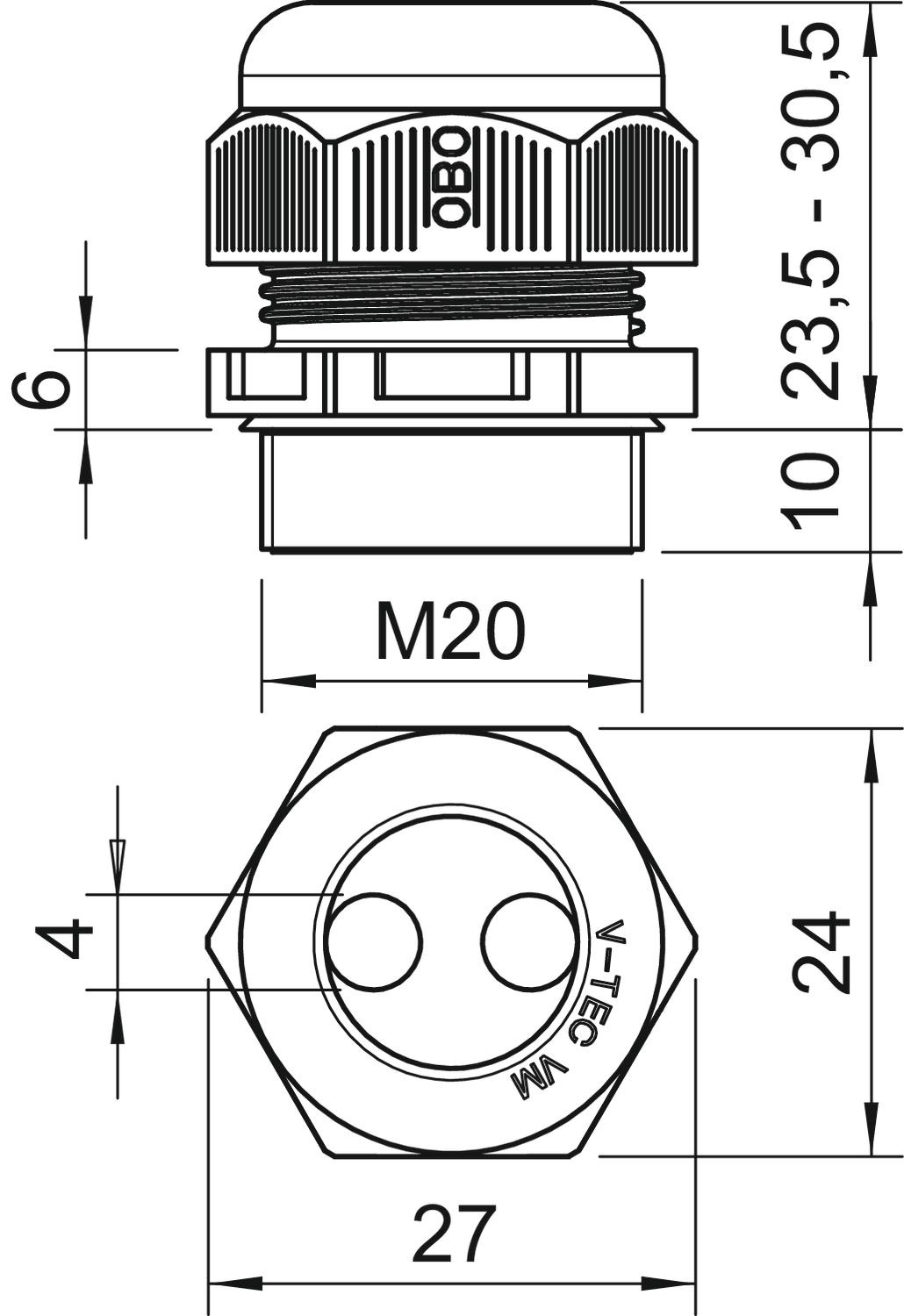 Bend protection no CO2 Footprint (GWP) Cradle-to-Gate 0,054 kg CO2e / 1 Piece Colour Light grey Dimension M20 Dimension D 4 mm Dimension E 27 mm Dimension L max. 30,5 mm Dimension L min. 23,5 mm Dimension L1 10 mm Dimension L2 6 mm explosion-proof no Fibre-glass reinforced no Flame-resistant acc. to VDE 0471/DIN 695 Part 2-1, test temperature 650°C Flat cable gland no For Ex zone Without For Ex zone dust Without For Ex zone gas Without Halogen-free yes Hexagonal corner dimension 27 mm Impact-resistant no Material Polyamide Nominal thread size 20 Number of drill holes 2 Permitted temperature range, max. 65 °C Permitted temperature range, min. -20 °C Protection rating IP68 Sealing insert, multiple yes Splittable gland no Strain relief option yes Thread M20 x 1,5 Thread increase 1,5 mm Thread length 10 mm Thread type Metric Type of seal Sealing ring Unstable torque 3,8 Nm Version for Straight WAF 24 With locknut no - All types