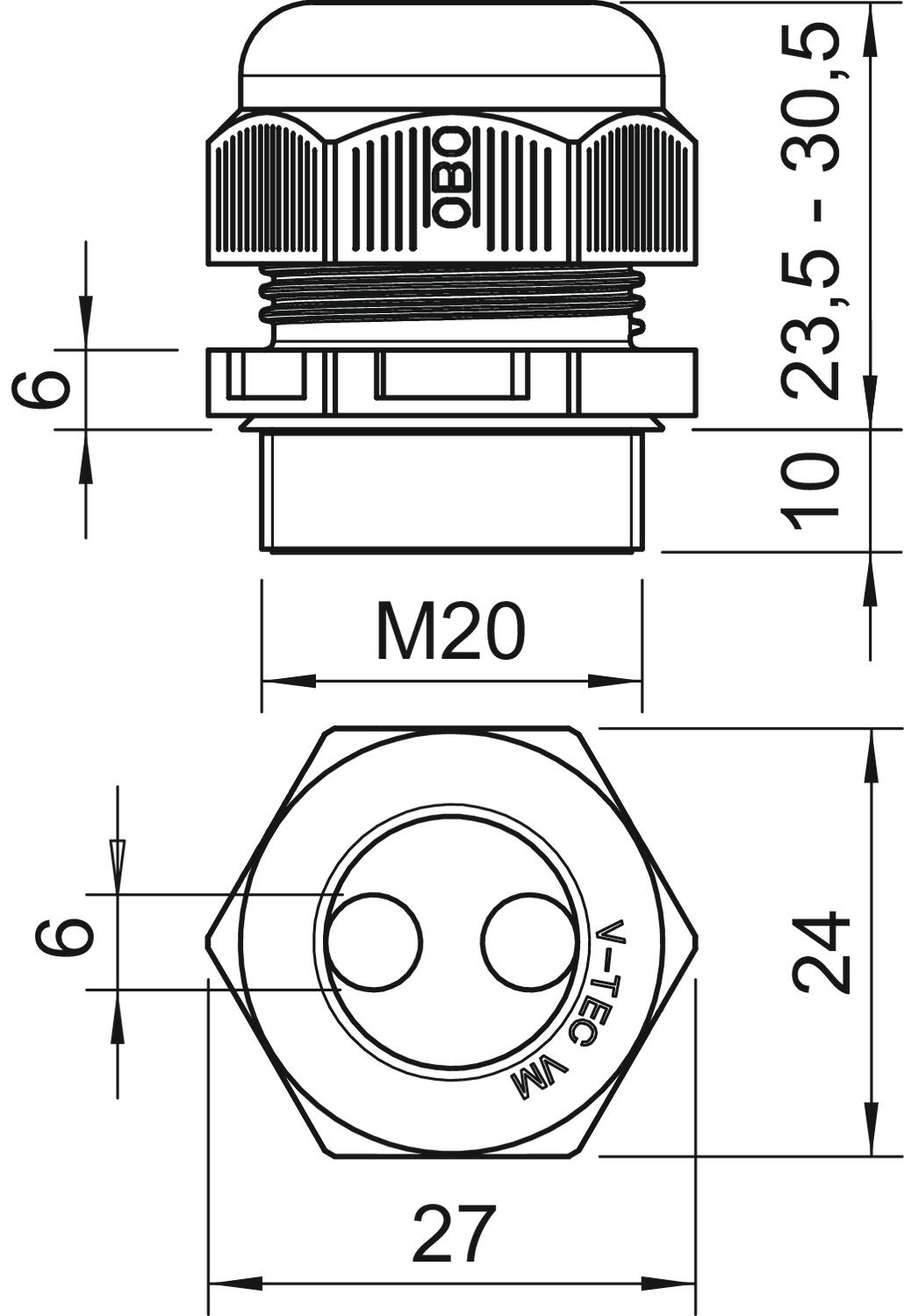 Bend protection no CO2 Footprint (GWP) Cradle-to-Gate 0,0454 kg CO2e / 1 Piece Colour Light grey Dimension M20 Dimension D 6 mm Dimension E 27 mm Dimension L max. 30,5 mm Dimension L min. 23,5 mm Dimension L1 10 mm Dimension L2 6 mm explosion-proof no Fibre-glass reinforced no Flame-resistant acc. to VDE 0471/DIN 695 Part 2-1, test temperature 650°C Flat cable gland no For Ex zone Without For Ex zone dust Without For Ex zone gas Without Halogen-free yes Hexagonal corner dimension 27 mm Impact-resistant no Material Polyamide Nominal thread size 20 Number of drill holes 2 Permitted temperature range, max. 65 °C Permitted temperature range, min. -20 °C Protection rating IP68 Sealing insert, multiple yes Splittable gland no Strain relief option yes Thread M20 x 1,5 Thread increase 1,5 mm Thread length 10 mm Thread type Metric Type of seal Sealing ring Unstable torque 3,8 Nm Version for Straight WAF 24 With locknut no - All types