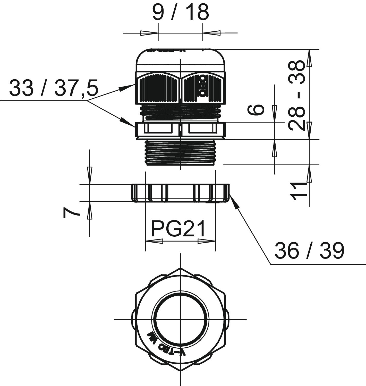 Bend protection no CO2 Footprint (GWP) Cradle-to-Gate 0,1211 kg CO2e / 1 Piece Colour Light grey; RAL 7035 Dimension PG21 Dimension E1 (mm) 37,5 mm Dimension E2 39 mm Dimension L max. 38 mm Dimension L min. 28 mm Dimension L1 11 mm Dimension L2 6 mm Dimension L3 7 mm explosion-proof no Fibre-glass reinforced no Flat cable gland no For Ex zone Without For Ex zone dust Without For Ex zone gas Without Halogen-free yes Hexagonal corner dimension 37,5 mm Impact-resistant no Material Polyamide Nominal thread size 21 Permitted temperature range, max. 65 °C Permitted temperature range, min. -20 °C Protection rating IP68 Sealing area D, max. 18 mm Sealing area D, min. 9 mm Sealing insert, multiple no Splittable gland no Strain relief option yes Thread Pg 21 Thread increase 1,5 mm Thread length 11 mm Thread type PG Type of seal Sealing ring Version for Straight WAF 1 33 mm WAF 2 36 mm With locknut yes - All types