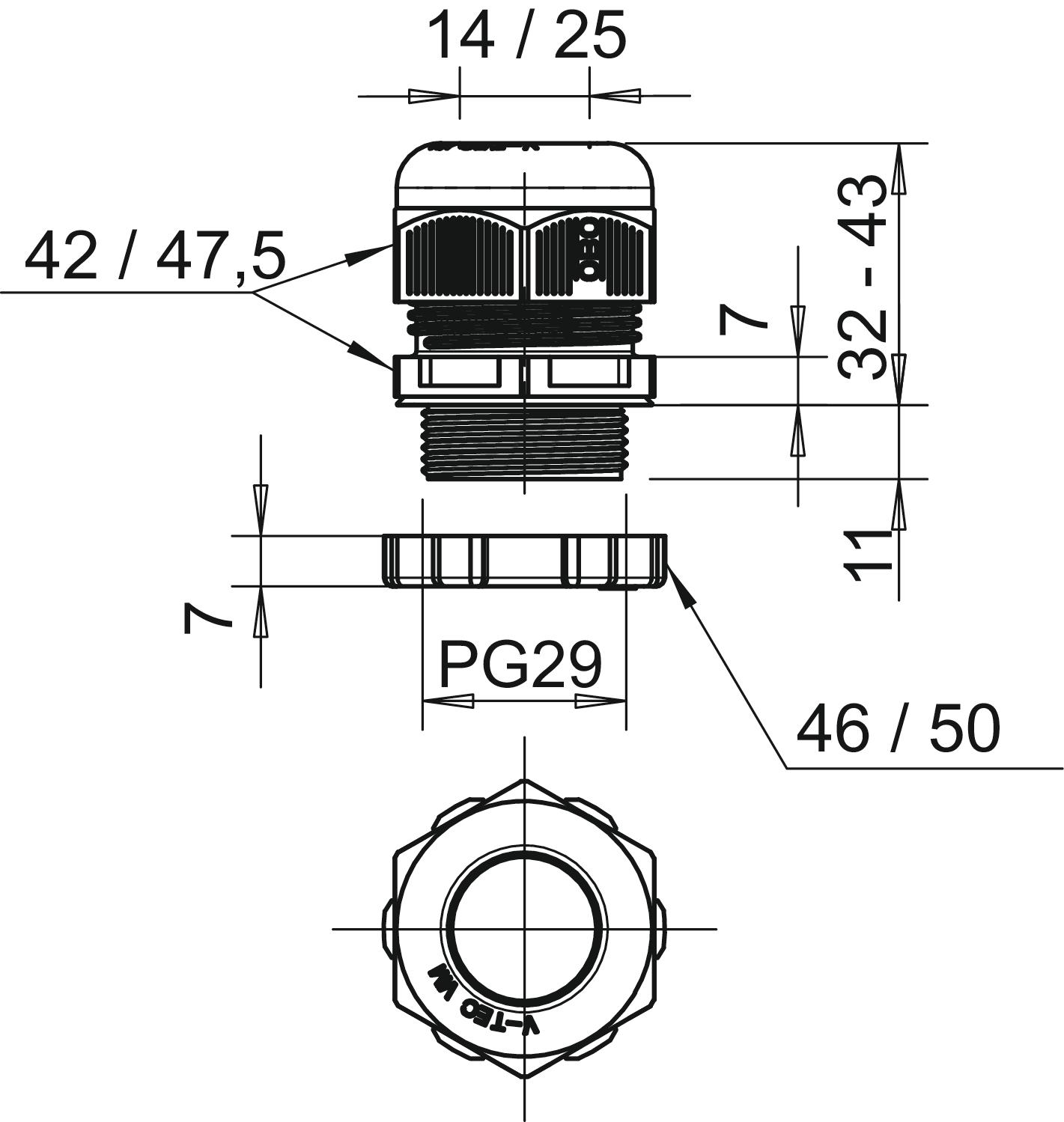 Bend protection no CO2 Footprint (GWP) Cradle-to-Gate 0,1937 kg CO2e / 1 Piece Colour Light grey; RAL 7035 Dimension PG29 Dimension E1 (mm) 47,5 mm Dimension E2 50 mm Dimension L max. 43 mm Dimension L min. 32 mm Dimension L1 11 mm Dimension L2 7 mm Dimension L3 7 mm explosion-proof no Fibre-glass reinforced no Flat cable gland no For Ex zone Without For Ex zone dust Without For Ex zone gas Without Halogen-free yes Hexagonal corner dimension 47,5 mm Impact-resistant no Material Polyamide Nominal thread size 29 Permitted temperature range, max. 65 °C Permitted temperature range, min. -20 °C Protection rating IP68 Sealing area D, max. 25 mm Sealing area D, min. 14 mm Sealing insert, multiple no Splittable gland no Strain relief option yes Thread Pg 29 Thread increase 1,5 mm Thread length 11 mm Thread type PG Type of seal Sealing ring Version for Straight WAF 1 42 mm WAF 2 46 mm With locknut yes - All types