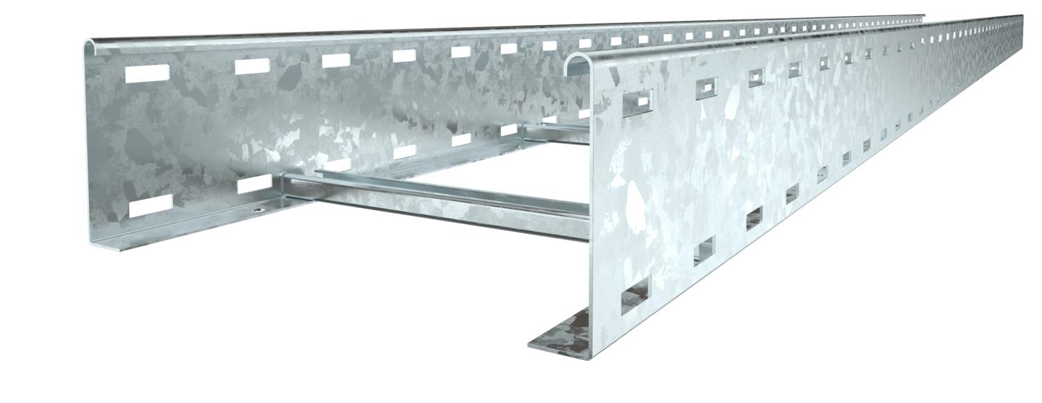 Product descriptionCable ladder with perforated side rail of side height 110 mm with riveted C profile rungs, open in an upwards direction.