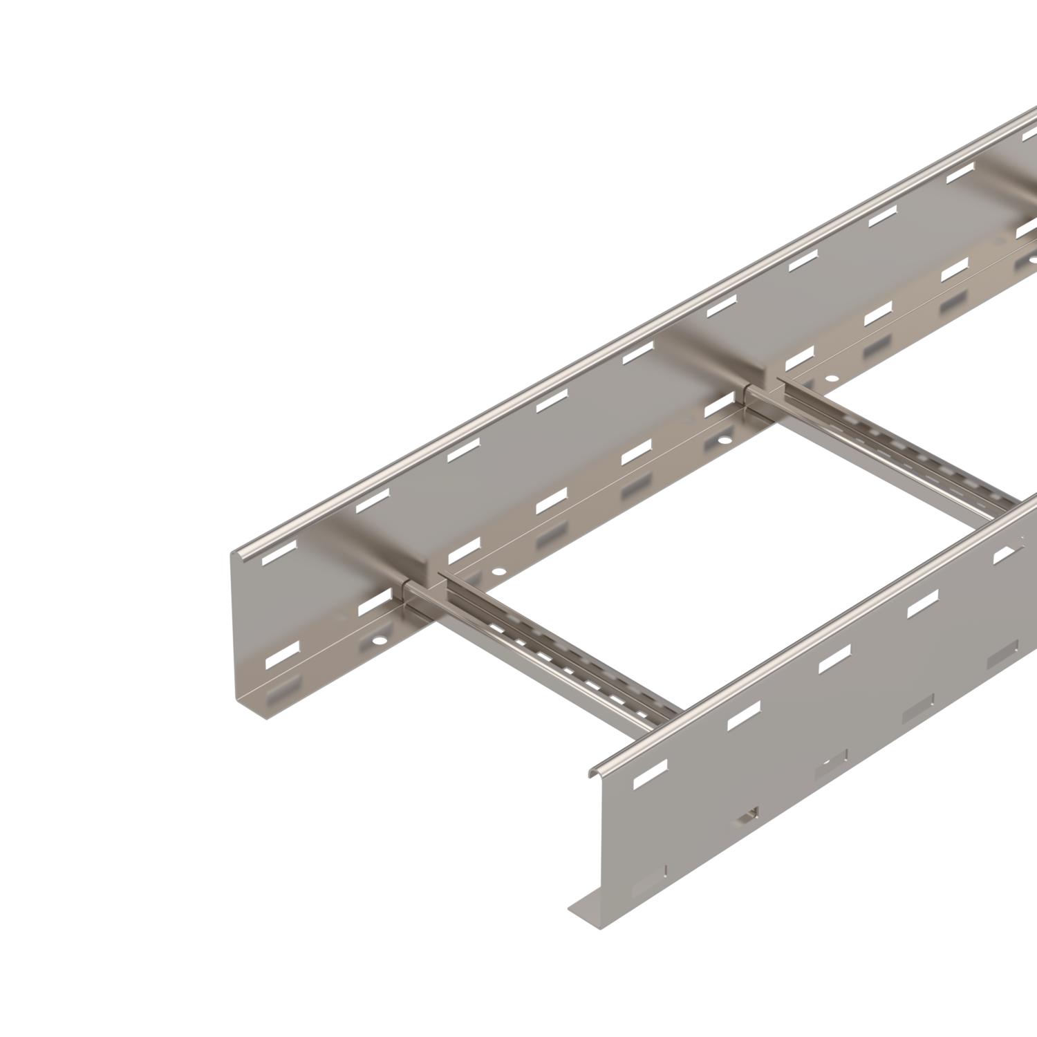 Product descriptionCable ladder with perforated side rail of side height 110 mm with riveted C profile rungs, open in an upwards direction.