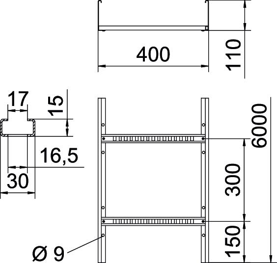 Product descriptionCable ladder with perforated side rail of side height 110 mm with riveted C profile rungs, open in an upwards direction.