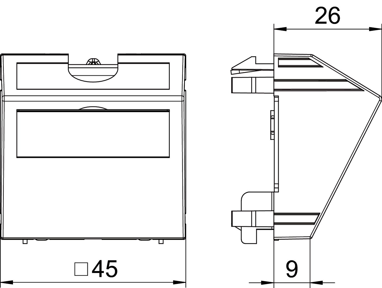CO2 Footprint (GWP) Cradle-to-Gate 0,3928 kg CO2e / 1 Piece Colour Aluminium painted Depth 26 mm Dimension 45x45mm Einbaubreite 45 mm Fastening type Clamp fastening Flush-mounted version yes Halogen-free yes Height 45 mm Hinged cover no Installation height 45 mm Material Polycarbonate Mounting direction Horizontal and vertical Number of units 1 Suitable for built-in installations no Suitable for device installation ducts yes Suitable for flush-mounted installations no Suitable for underfloor duct socket no Surface version Matt Text field/inscription field yes Transparent no Width 45 mm - All types