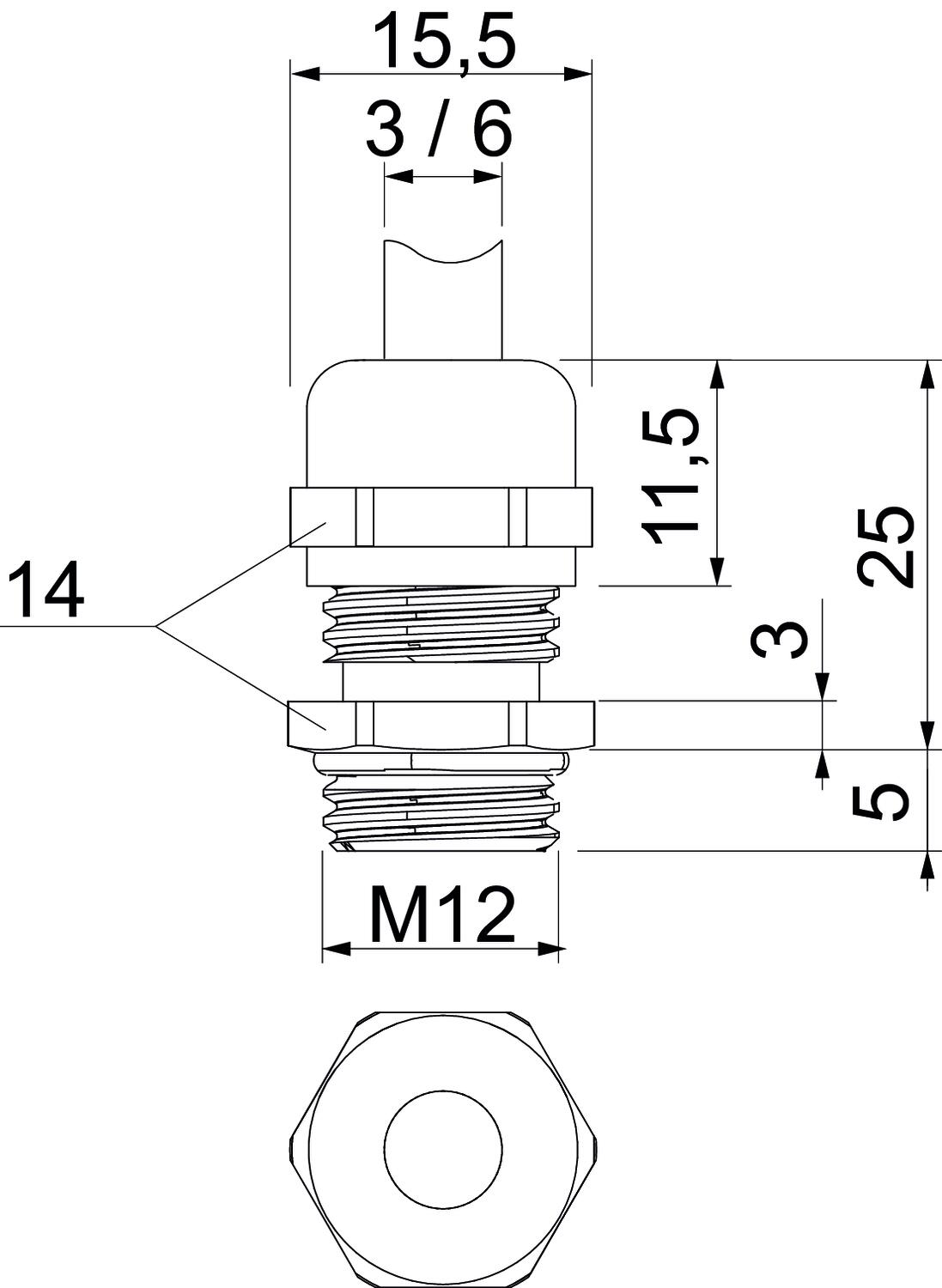 Bend protection no CO2 Footprint (GWP) Cradle-to-Gate 0,0455 kg CO2e / 1 Piece Dimension M12 Dimension E 15,5 mm Dimension L max. 25 mm Dimension L1 5 mm Dimension L2 3 mm Dimension L3 11,5 mm Fibre-glass reinforced no Flat cable gland no For Ex zone Without Halogen-free no Impact-resistant no Material Brass Permitted temperature range, max. 100 °C Permitted temperature range, min. -20 °C Protection rating IP68 Sealing area D, max. 6 mm Sealing area D, min. 3 mm Sealing insert, multiple no Strain relief option yes Surface Nickel-plated Thread M12 x 1,5 Thread length 5 mm Thread type Metric Type of seal Sealing ring Unstable torque 3,5 Nm Version for Straight WAF 14 With locknut no - All types
