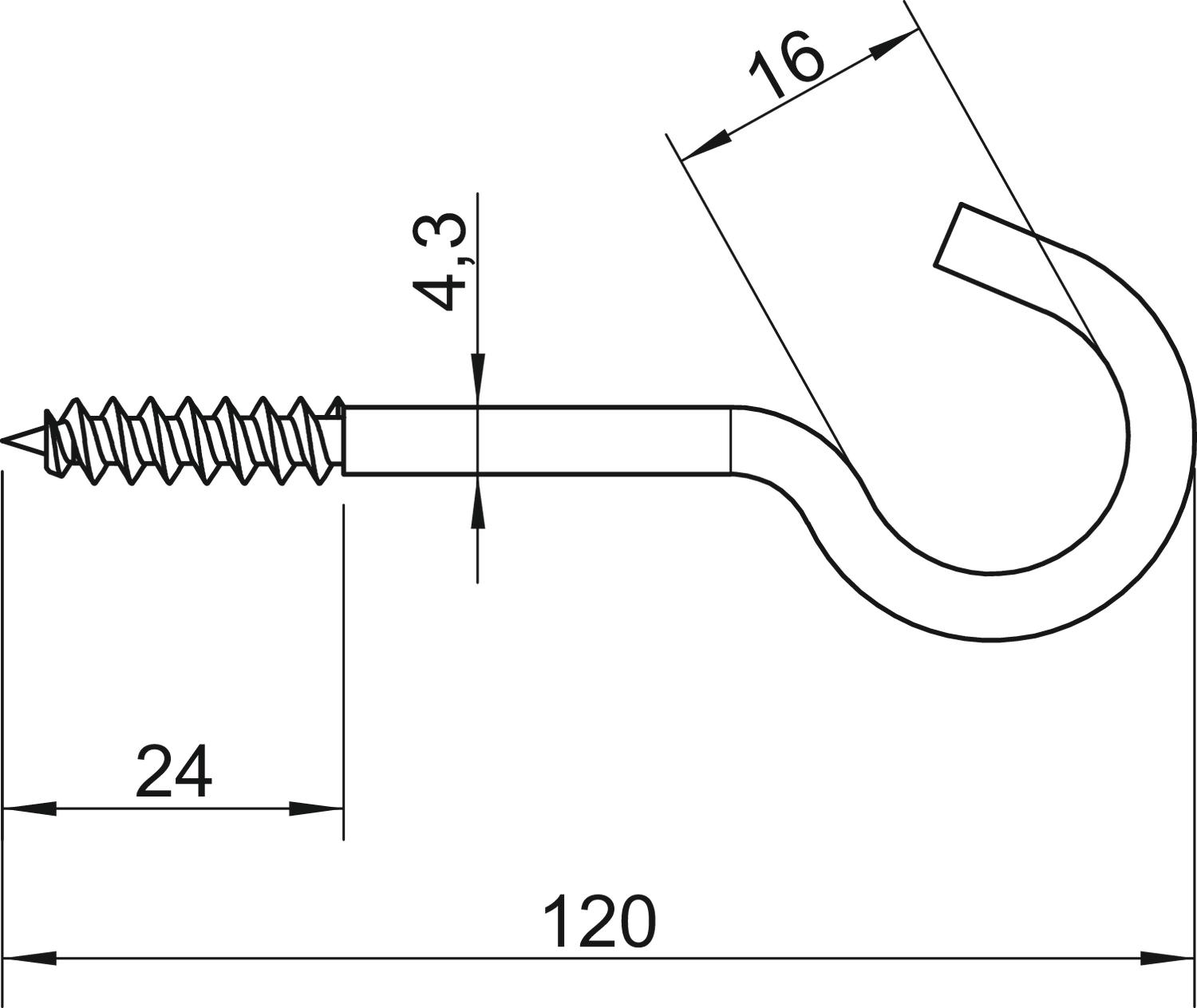 Breaking load 0,2 kN Dimension 4,2x120mm Dimension L 120 mm Dimension L1 24 mm hook diameter 16 mm Length 120 mm Material Steel Material diameter 4,3 mm Plastic-covered no Surface Electrogalvanized Thread length 24 mm - All types