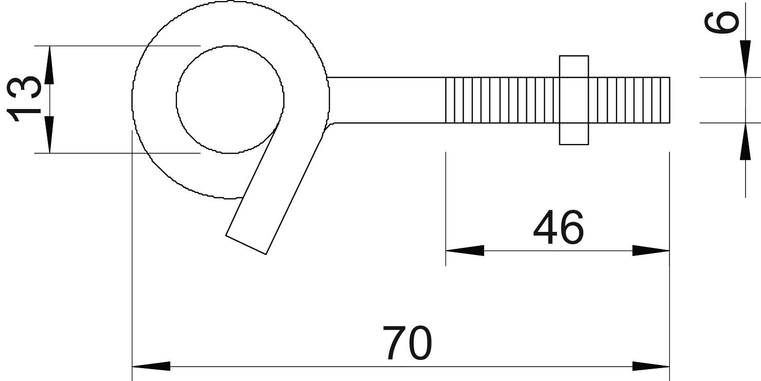 Breaking load 1 kN CO2 Footprint (GWP) Cradle-to-Gate 0,0975 kg CO2e / 1 Piece Dimension M6x70mm Dimension d 6 mm Dimension d Ø 13 mm Dimension L 70 mm Dimension L1 46 mm hook diameter 13 mm Length 70 mm Material Steel Material diameter 6 mm Plastic-covered no Surface Electrogalvanized Thread M6 Thread length 40 mm Washer Ø 18 mm - All types