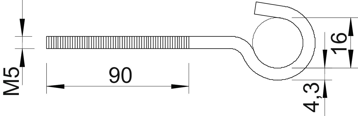 Breaking load 0,4 kN CO2 Footprint (GWP) Cradle-to-Gate 0,0417 kg CO2e / 1 Piece Dimension M5x125mm Dimension d Ø 4,3 mm Dimension L 90 mm hook diameter 16 mm Length 125 mm Material Steel Plastic-covered no Surface Electrogalvanized Thread M5 Thread length 90 mm - All types