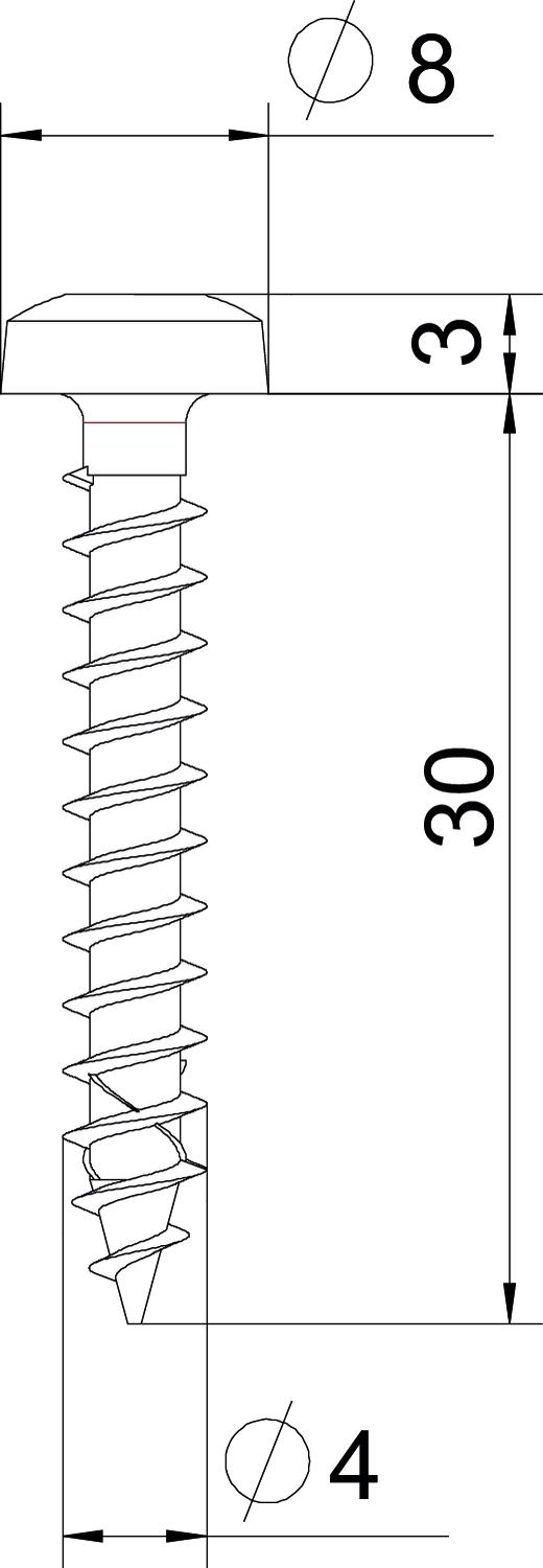 Dimension 4x30mm Dimension D 4 mm Dimension L 30 mm Drive size TX 20 Hardened no Head diameter 8 mm Head shape Panhead Length 30 mm Material Stainless steel Screw system Torx Surface Bright, treated Two-compartment no - All types