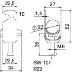 Clamping range D, max. 22 mm Clamping range D, min. 16 mm CO2 Footprint (GWP) Cradle-to-Gate 0,0942 kg CO2e / 1 Piece Dimension 16-22mm Dimension A 22,5 mm Dimension B 27 mm Dimension C 34 mm Dimension G (mm) M6 Dimension H 52 mm Dimension L 35 mm Dimension t 1,5 mm For pipe diameter, max. 22 mm For pipe diameter, min. 16 mm for rail with slot width (with interval), max. 17 mm for rail with slot width (with interval), min. 16 mm Halogen-free yes Height 52 mm Length 22,5 mm Length of external dimensions 34 mm Material Steel Material addition Steel Material of trough Plastic Material quality of trough Polypropylene Max. Tightening torque 3 Nm Mounting type Profile rail Number of cables/pipes 1 Plate thickness 1,5 mm Slot width 10 mm Surface Hot-dip galvanised Surface addition hot galvanised Thread M6 Width 27 mm With counter-trough no With plastic trough yes - All types