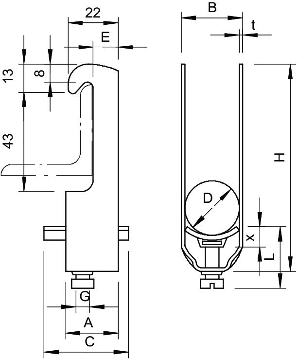 Clamping range D, max. 40 mm Clamping range D, min. 34 mm CO2 Footprint (GWP) Cradle-to-Gate 0,3956 kg CO₂e / 1 Piece Dimension 34-40mm Dimension A 23 mm Dimension B 45 mm Dimension C 34 mm Dimension E 11 mm Dimension G (mm) M8 Dimension H 105 mm Dimension L 31,5 mm Dimension t 2 mm Dimension x 5,5 mm for 1 cable H 105 mm for 1 cable L 31,5 For pipe diameter, max. 40 mm For pipe diameter, min. 40 mm Halogen-free yes Impact-resistant no Material Aluminium Material addition Aluminium Material of trough Plastic Material quality of trough Polypropylene Max. Tightening torque 2 Nm Mounting type Angle profile Number of cables/pipes 1 Surface addition Untreated With counter-trough no With metal trough no With plastic trough yes - All types