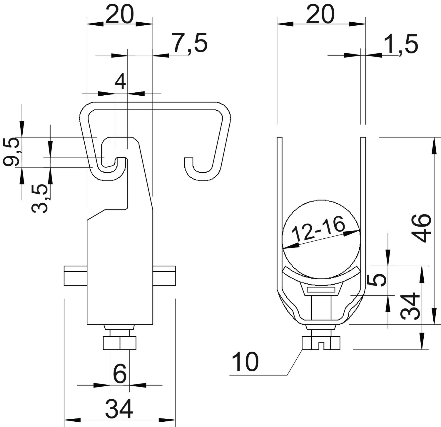 Clamping range D, max. 16 mm Clamping range D, min. 12 mm CO2 Footprint (GWP) Cradle-to-Gate 0,0657 kg CO₂e / 1 Piece Dimension 12-16mm Dimension A 20 mm Dimension B 20 mm Dimension C 34 mm Dimension G (mm) M6 Dimension H 46 mm Dimension L 34 mm Dimension t 1,5 mm Dimension x 5 mm For pipe diameter, max. 16 mm For pipe diameter, min. 16 mm for rail with slot width (with interval), max. 22 mm for rail with slot width (with interval), min. 18 mm Halogen-free no Impact-resistant no Material Steel Material addition Steel Material of trough Steel Max. Tightening torque 3 Nm Mounting type Profile rail Number of cables/pipes 1 Surface Hot-dip galvanised Surface addition hot galvanised With counter-trough no With metal trough yes With plastic trough no - All types