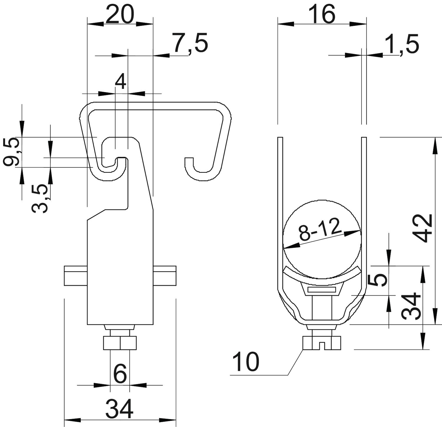 Clamping range D, max. 12 mm Clamping range D, min. 8 mm CO2 Footprint (GWP) Cradle-to-Gate 0,0605 kg CO₂e / 1 Piece Dimension 8-12mm Dimension A 20 mm Dimension B 16 mm Dimension C 34 mm Dimension G (mm) M6 Dimension H 42 mm Dimension L 34 mm Dimension t 1,5 mm Dimension x 5 mm for rail with slot width (with interval), max. 22 mm for rail with slot width (with interval), min. 18 mm Halogen-free no Impact-resistant no Material Steel Material addition Steel Material of trough Steel Max. Tightening torque 3 Nm Mounting type Profile rail Number of cables/pipes 1 Surface Hot-dip galvanised Surface addition hot galvanised With counter-trough no With metal trough yes With plastic trough no - All types