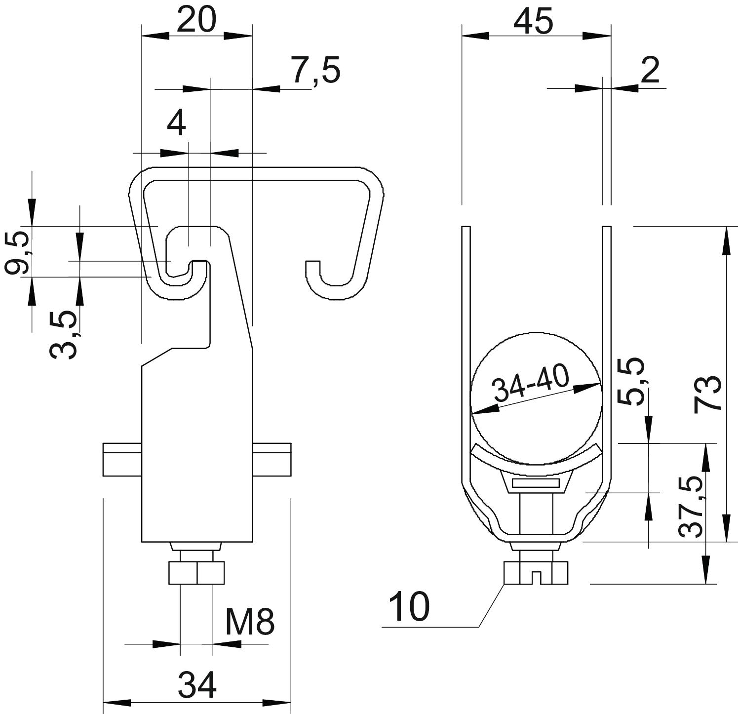 Clamping range D, max. 40 mm Clamping range D, min. 34 mm CO2 Footprint (GWP) Cradle-to-Gate 0,1451 kg CO₂e / 1 Piece Dimension 34-40mm Dimension A 20 mm Dimension B 45 mm Dimension C 34 mm Dimension G (mm) M8 Dimension H 73 mm Dimension L 37,5 mm Dimension t 2 mm Dimension x 5,5 mm for 1 cable H 73 mm for 1 cable L 37,5 for 2 cable H 115 mm for 2 cable L 44,5 mm for 3 cable H 157 mm for 3 cable L 44,5 mm For pipe diameter, max. 40 mm For pipe diameter, min. 40 mm for rail with slot width (with interval), max. 22 mm for rail with slot width (with interval), min. 18 mm Halogen-free yes Impact-resistant no Material Steel Material addition Steel Material of trough Plastic Material quality of trough Polypropylene Max. Tightening torque 5 Nm Mounting type Profile rail Number of cables/pipes 1 Surface Hot-dip galvanised Surface addition hot galvanised With counter-trough no With metal trough no With plastic trough yes - All types
