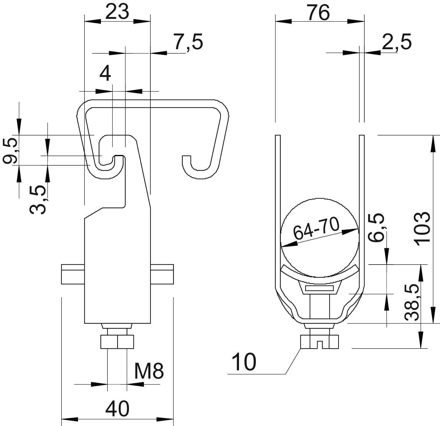 Clamping range D, max. 70 mm Clamping range D, min. 64 mm CO2 Footprint (GWP) Cradle-to-Gate 0,2729 kg CO₂e / 1 Piece Dimension 64-70mm Dimension A 23 mm Dimension B 76 mm Dimension C 40 mm Dimension G (mm) M8 Dimension H 103 mm Dimension L 38,5 mm Dimension t 2,5 mm Dimension x 6,5 mm for 1 cable H 103 mm for 1 cable L 38,5 for rail with slot width (with interval), max. 22 mm for rail with slot width (with interval), min. 18 mm Halogen-free yes Impact-resistant no Material Steel Material addition Steel Material of trough Plastic Material quality of trough Polypropylene Max. Tightening torque 5 Nm Mounting type Profile rail Number of cables/pipes 1 Surface Hot-dip galvanised Surface addition hot galvanised With counter-trough no With metal trough no With plastic trough yes - All types