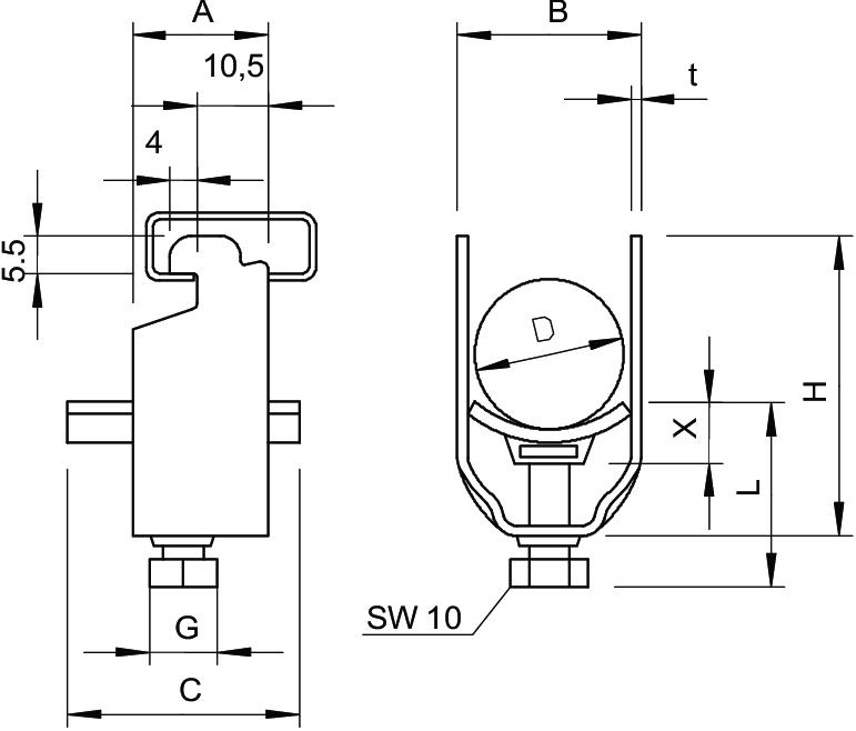 Clamping range D, max. 12 mm Clamping range D, min. 8 mm CO2 Footprint (GWP) Cradle-to-Gate 0,0579 kg CO₂e / 1 Piece Dimension 8-12mm Dimension A 20 mm Dimension B 16 mm Dimension C 30 mm Dimension G (mm) M6 Dimension H 34 mm Dimension L 32,5 mm Dimension t 1,5 mm Dimension x 3,5 mm for 1 cable H 34 mm for 1 cable L 32,5 for 2 cable H 49 mm for 2 cable L 45,5 mm for 3 cable H 65 mm for 3 cable L 45,5 mm for rail with slot width (with interval), max. 12 mm for rail with slot width (with interval), min. 11 mm Halogen-free no Impact-resistant no Material Steel Material addition Steel Material of trough Steel Max. Tightening torque 3 Nm Mounting type Profile rail Number of cables/pipes 1 Surface Hot-dip galvanised Surface addition hot galvanised With counter-trough no With metal trough yes With plastic trough no - All types