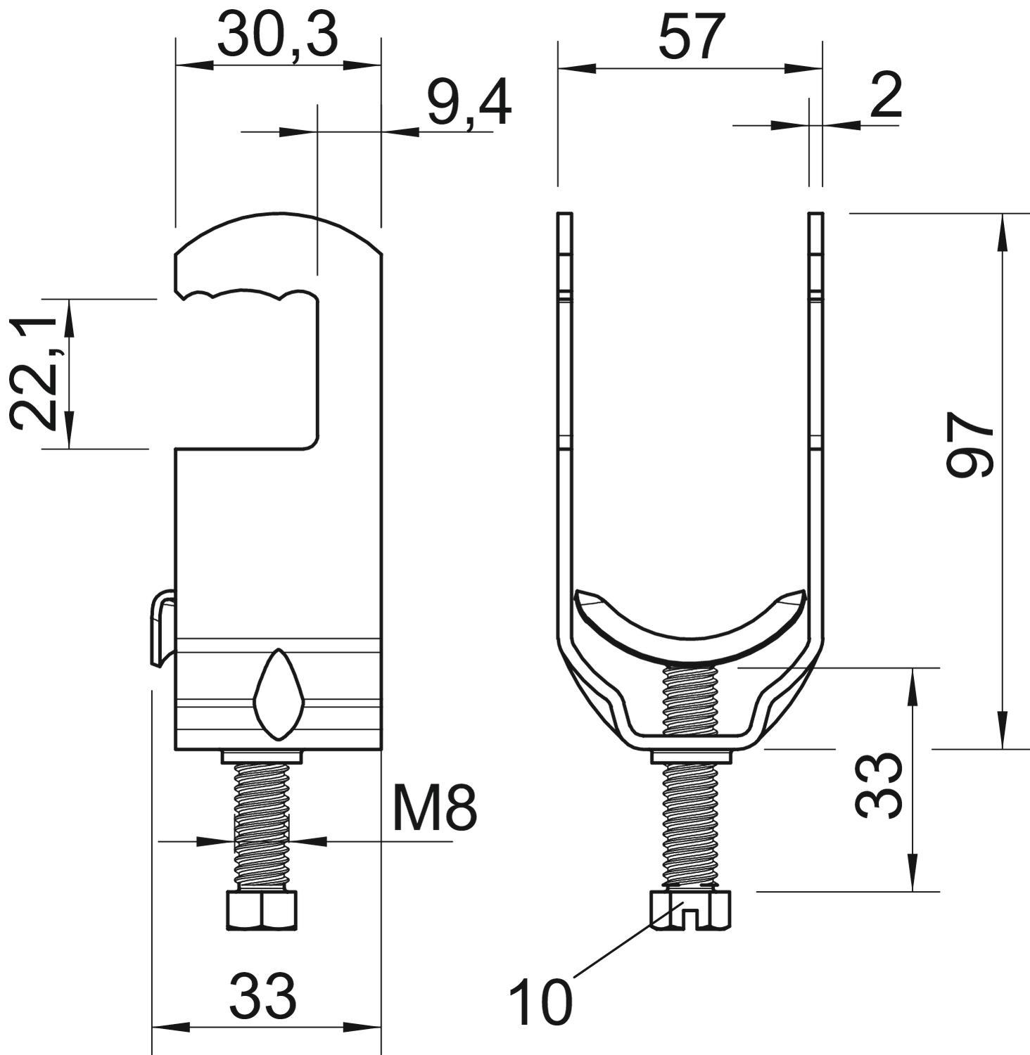 Product descriptionSuitable for all round profile irons or pipes of diameters to 22 mm; clip, pressure trough and bolt made of steel, hot-dip galvanised;