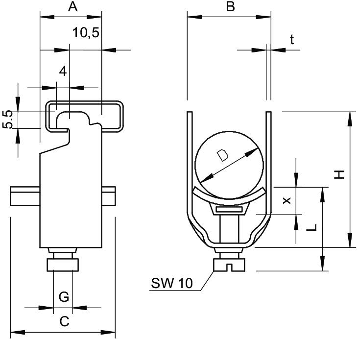 Clamping range D, max. 46 mm Clamping range D, min. 40 mm CO2 Footprint (GWP) Cradle-to-Gate 0,3354 kg CO₂e / 1 Piece Dimension 40-46mm Dimension A 20 mm Dimension B 51 mm Dimension C 40 mm Dimension G (mm) M8 Dimension H 72 mm Dimension L 55 mm Dimension t 2 mm Dimension x 5,5 mm for 1 cable H 72 mm for 1 cable L 37,5 For pipe diameter, max. 40 mm For pipe diameter, min. 40 mm for rail with slot width (with interval), max. 12 mm for rail with slot width (with interval), min. 11 mm Halogen-free yes Impact-resistant no Material Aluminium Material addition Aluminium Material of trough Plastic Material quality of trough Polypropylene Max. Tightening torque 2 Nm Mounting type Profile rail Number of cables/pipes 1 Surface addition Untreated With counter-trough no With metal trough no With plastic trough yes - All types