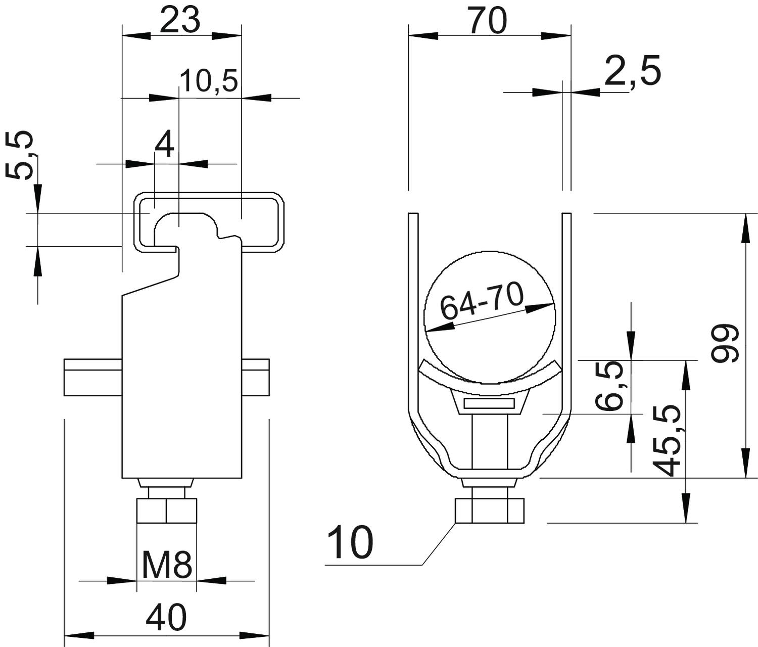 Clamping range D, max. 70 mm Clamping range D, min. 64 mm CO2 Footprint (GWP) Cradle-to-Gate 0,2573 kg CO₂e / 1 Piece Dimension 64-70mm Dimension A 23 mm Dimension B 76 mm Dimension C 40 mm Dimension G (mm) M8 Dimension H 99 mm Dimension L 45,5 mm Dimension t 2,5 mm Dimension x 6,5 mm for 1 cable H 99 mm for 1 cable L 45,5 for rail with slot width (with interval), max. 12 mm for rail with slot width (with interval), min. 11 mm Halogen-free yes Impact-resistant no Material Steel Material addition Steel Material of trough Plastic Material quality of trough Polypropylene Max. Tightening torque 5 Nm Mounting type Profile rail Number of cables/pipes 1 Surface Hot-dip galvanised Surface addition hot galvanised With counter-trough no With metal trough no With plastic trough yes - All types