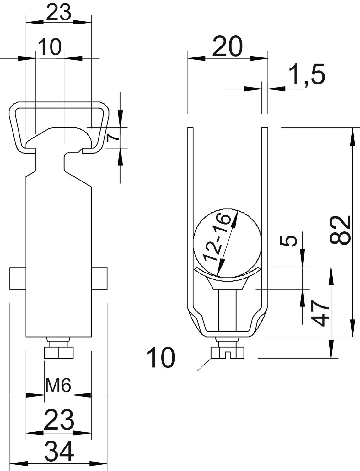 Clamping range D, max. 16 mm Clamping range D, min. 12 mm CO2 Footprint (GWP) Cradle-to-Gate 0,1151 kg CO₂e / 1 Piece Dimension 12-16mm Dimension A 23 mm Dimension B 20 mm Dimension C 34 mm Dimension G (mm) M6 Dimension H 82 mm Dimension L 47 mm Dimension t 1,5 mm Dimension x 5 mm for rail with slot width (with interval), max. 17 mm for rail with slot width (with interval), min. 16 mm Halogen-free yes Impact-resistant no Material Steel Material addition Steel Material of trough Plastic Material quality of trough Polypropylene Max. Tightening torque 3 Nm Mounting type Profile rail Number of cables/pipes 3 Surface Hot-dip galvanised Surface addition hot galvanised With counter-trough no With metal trough no With plastic trough yes - All types