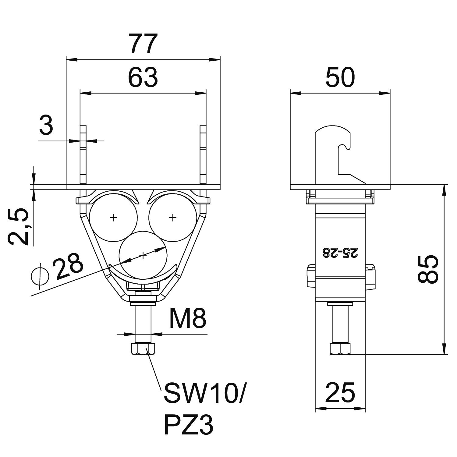 Cable diameter, max. 28 mm Cable diameter, min. 25 mm Clamping range D, max. 28 mm Clamping range D, min. 25 mm CO2 Footprint (GWP) Cradle-to-Gate 0,5142 kg CO2e / 1 Piece Dimension 25-28mm Dimension A 77 mm Dimension B 63 mm Dimension H 101 mm for rail with slot width (with interval), max. 22 mm for rail with slot width (with interval), min. 18 mm Halogen-free yes Impact-resistant no Material Steel Material addition Steel Material of counter-trough Plastic Material of trough Plastic Material quality of trough Polypropylene Max. Tightening torque 5 Nm Mounting type Profile rail Number of cables/pipes 3 Surface Hot-dip galvanised Surface addition hot galvanised With counter-trough yes With metal trough no With plastic trough yes - All types
