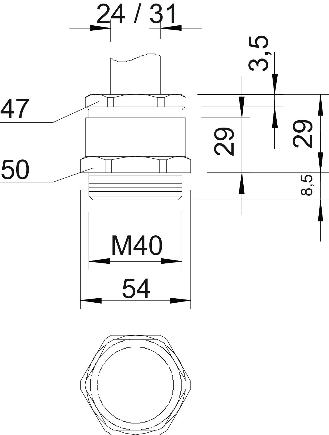 Bend protection no CO2 Footprint (GWP) Cradle-to-Gate 0,4423 kg CO2e / 1 Piece Dimension M40 Dimension E 54 mm Dimension L 29 mm Dimension L max. 29 mm Dimension L1 8,5 mm Dimension L2 29 mm Dimension L3 3,5 mm explosion-proof no Fibre-glass reinforced no Flat cable gland no For Ex zone Without Halogen-free no Impact-resistant no Material Brass Protection rating IP65 Sealing area D, max. 31 mm Sealing area D, min. 24 mm Sealing insert, multiple no Strain relief option no Surface Nickel-plated Thread M40 x 1,5 Thread length 8,5 mm Thread type Metric Type of seal Cuttable sealing ring WAF 1 50 mm WAF 2 47 mm With locknut no - All types