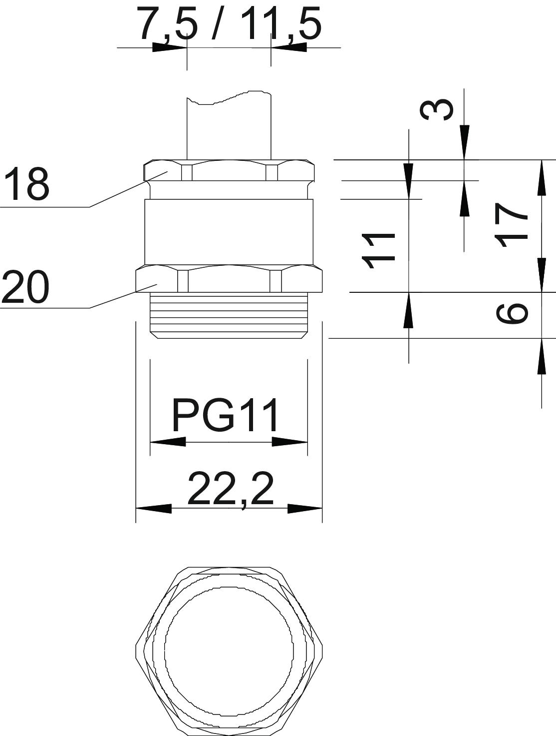 Bend protection no CO2 Footprint (GWP) Cradle-to-Gate 0,0742 kg CO2e / 1 Piece Dimension PG11 Dimension E 22,2 mm Dimension L 17 mm Dimension L max. 17 mm Dimension L1 6 mm Dimension L2 11 mm Dimension L3 3 mm explosion-proof no Fibre-glass reinforced no Flat cable gland no For Ex zone Without Halogen-free no Impact-resistant no Material Brass Protection rating IP65 Sealing area D, max. 11,5 mm Sealing area D, min. 7,5 mm Sealing insert, multiple no Strain relief option no Surface Nickel-plated Thread Pg 11 Thread length 6 mm Thread type PG Type of seal Cuttable sealing ring WAF 1 20 mm WAF 2 18 mm With locknut no - All types