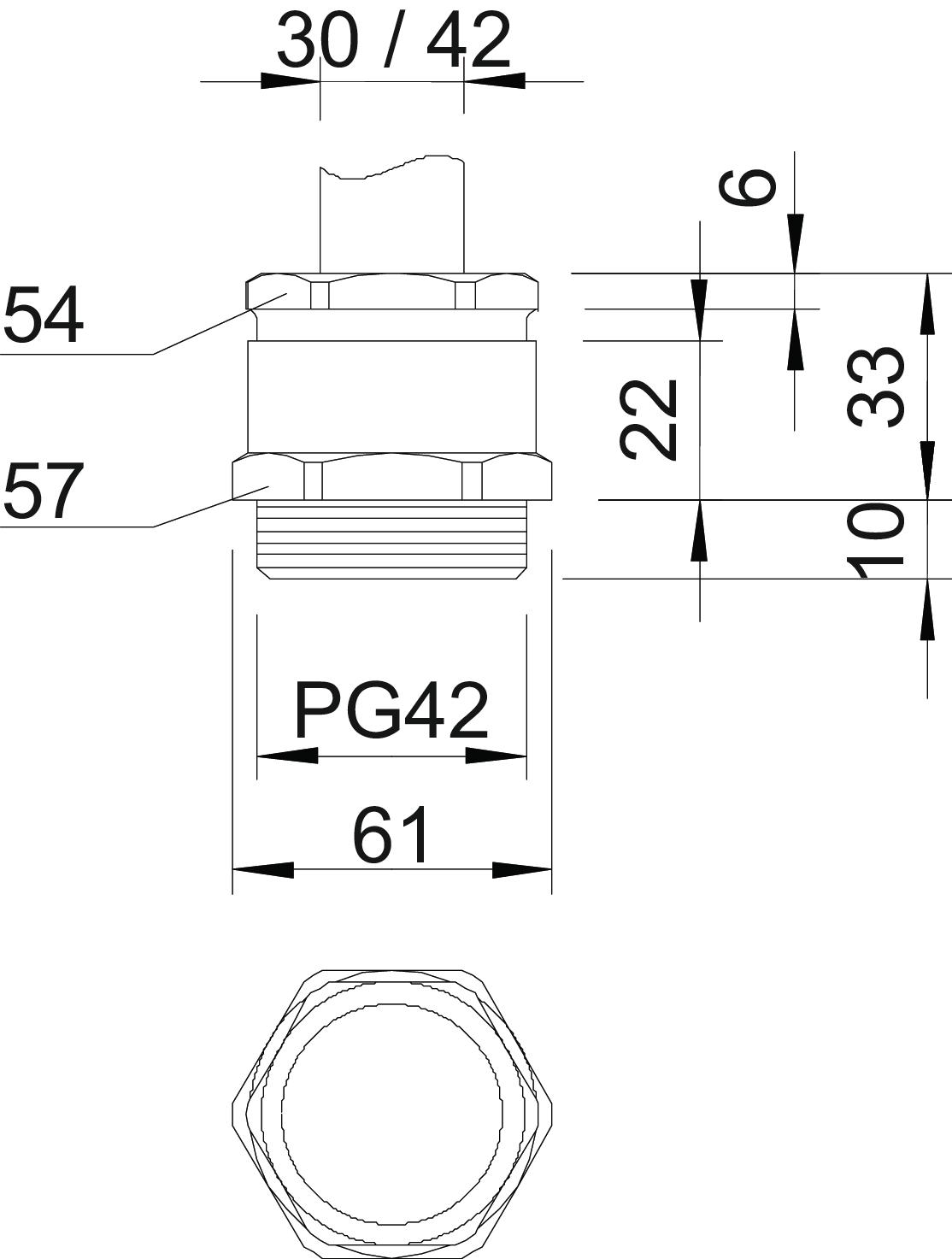 Bend protection no CO2 Footprint (GWP) Cradle-to-Gate 1,0044 kg CO2e / 1 Piece Dimension PG42 Dimension E 61 mm Dimension L 33 mm Dimension L max. 33 mm Dimension L1 10 mm Dimension L2 22 mm Dimension L3 6 mm explosion-proof no Fibre-glass reinforced no Flat cable gland no For Ex zone Without Halogen-free no Impact-resistant no Material Brass Permitted temperature range, max. 65 °C Permitted temperature range, min. -20 °C Protection rating IP54 Sealing area D, max. 42 mm Sealing area D, min. 30 mm Sealing insert, multiple no Strain relief option no Surface Nickel-plated Thread Pg 42 Thread length 10 mm Thread type PG Type of seal Cuttable sealing ring WAF 1 57 mm WAF 2 54 mm With locknut no - All types
