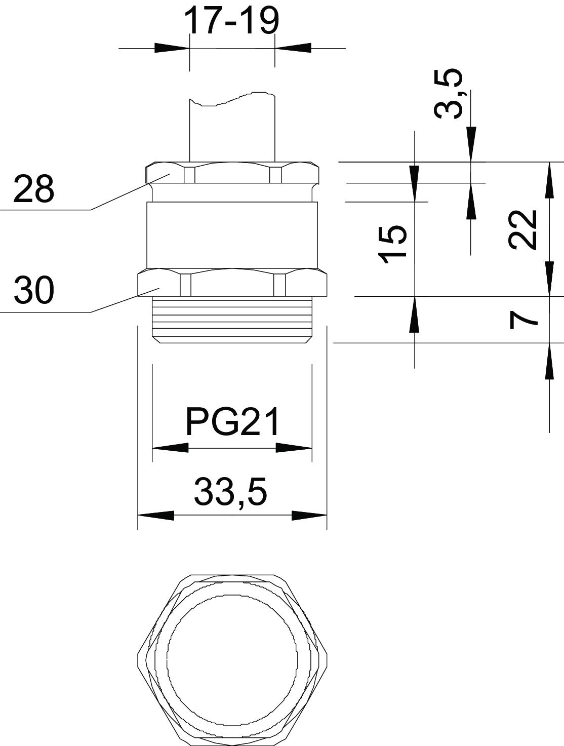 Bend protection no CO2 Footprint (GWP) Cradle-to-Gate 0,1291 kg CO2e / 1 Piece Dimension PG21 Dimension E 33,5 mm Dimension L 22 mm Dimension L max. 22 mm Dimension L1 7 mm Dimension L2 15 mm Dimension L3 3,5 mm explosion-proof no Fibre-glass reinforced no Flat cable gland no For Ex zone Without Halogen-free no Impact-resistant no Material Brass Protection rating IP54 Sealing area D, max. 19 mm Sealing area D, min. 17 mm Sealing insert, multiple no Strain relief option no Surface Nickel-plated Thread Pg 21 Thread length 7 mm Thread type PG Type of seal Sealing ring WAF 1 30 mm WAF 2 28 mm With locknut no - All types