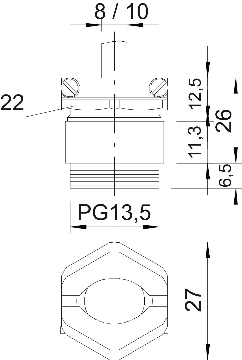 Bend protection no CO2 Footprint (GWP) Cradle-to-Gate 0,137 kg CO2e / 1 Piece Dimension PG13,5 Dimension E 27 mm Dimension L max. 26 mm Dimension L1 6,5 mm Dimension L2 12,5 mm Dimension L3 11,3 mm explosion-proof no Fibre-glass reinforced no Flat cable gland no For Ex zone Without Halogen-free no Impact-resistant no Material Brass Protection rating IP65 Sealing area D, max. 10 mm Sealing area D, min. 8 mm Sealing insert, multiple no Strain relief option yes Surface Nickel-plated Thread Pg 13,5 Thread length 6,5 mm Thread type PG Type of seal Sealing ring WAF 22 WAF 1 22 mm WAF 2 24 mm With locknut no - All types