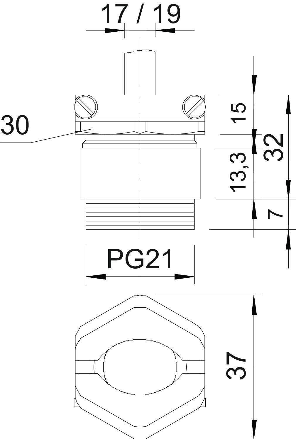 Bend protection no CO2 Footprint (GWP) Cradle-to-Gate 0,2112 kg CO2e / 1 Piece Dimension PG21 Dimension E 37 mm Dimension L max. 32 mm Dimension L1 7 mm Dimension L2 15 mm Dimension L3 13,3 mm explosion-proof no Fibre-glass reinforced no Flat cable gland no For Ex zone Without Halogen-free no Impact-resistant no Material Brass Protection rating IP65 Sealing area D, max. 19 mm Sealing area D, min. 17 mm Sealing insert, multiple no Strain relief option yes Surface Nickel-plated Thread Pg 21 Thread length 7 mm Thread type PG Type of seal Sealing ring WAF 30 WAF 1 30 mm WAF 2 33 mm With locknut no - All types