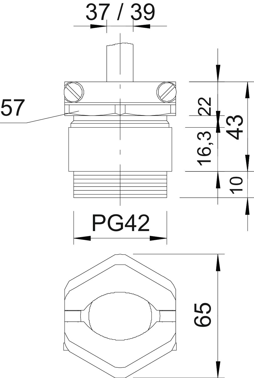Bend protection no CO2 Footprint (GWP) Cradle-to-Gate 1,4386 kg CO2e / 1 Piece Dimension PG42 Dimension E 65 mm Dimension L max. 43 mm Dimension L1 10 mm Dimension L2 22 mm Dimension L3 16,3 mm explosion-proof no Fibre-glass reinforced no Flat cable gland no For Ex zone Without Halogen-free no Impact-resistant no Material Brass Protection rating IP65 Sealing area D, max. 39 mm Sealing area D, min. 37 mm Sealing insert, multiple no Strain relief option yes Surface Nickel-plated Thread Pg 42 Thread length 10 mm Thread type PG Type of seal Sealing ring WAF 57 WAF 1 57 mm WAF 2 59 mm With locknut no - All types