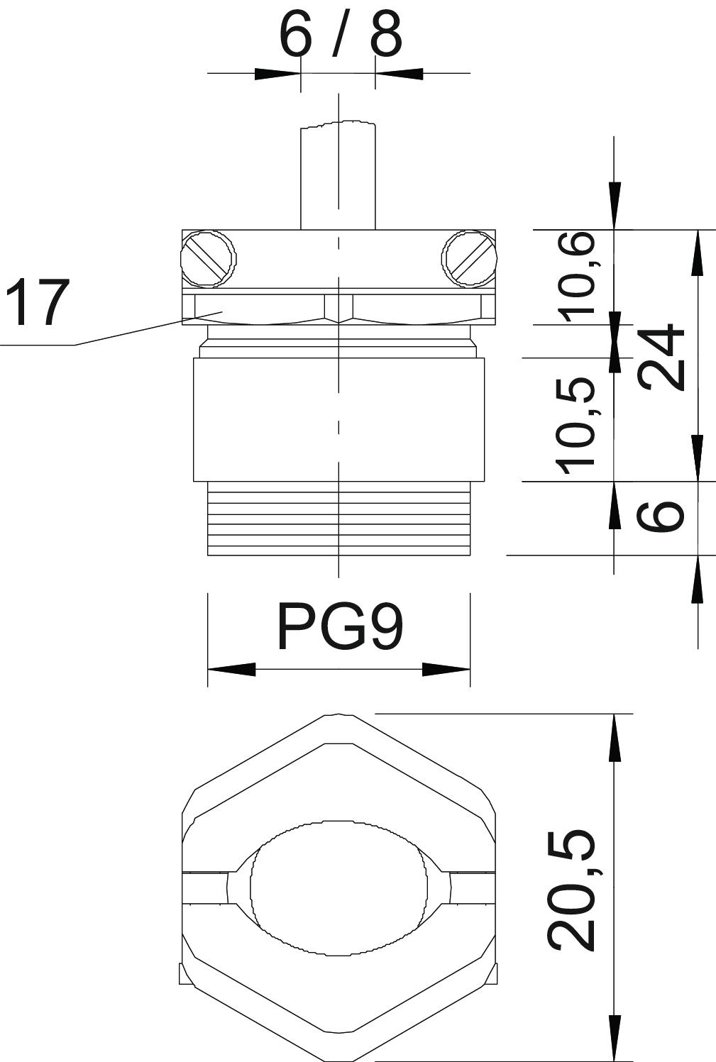 Bend protection no CO2 Footprint (GWP) Cradle-to-Gate 0,0813 kg CO2e / 1 Piece Dimension PG9 Dimension E 20,5 mm Dimension L max. 24 mm Dimension L1 6 mm Dimension L2 10,5 mm Dimension L3 10,6 mm explosion-proof no Fibre-glass reinforced no Flat cable gland no For Ex zone Without Halogen-free no Impact-resistant no Material Brass Protection rating IP54 Sealing area D, max. 8 mm Sealing area D, min. 6 mm Sealing insert, multiple no Strain relief option yes Surface Nickel-plated Thread Pg 9 Thread length 6 mm Thread type PG Type of seal Sealing ring WAF 17 WAF 1 17 mm WAF 2 19 mm With locknut no - All types