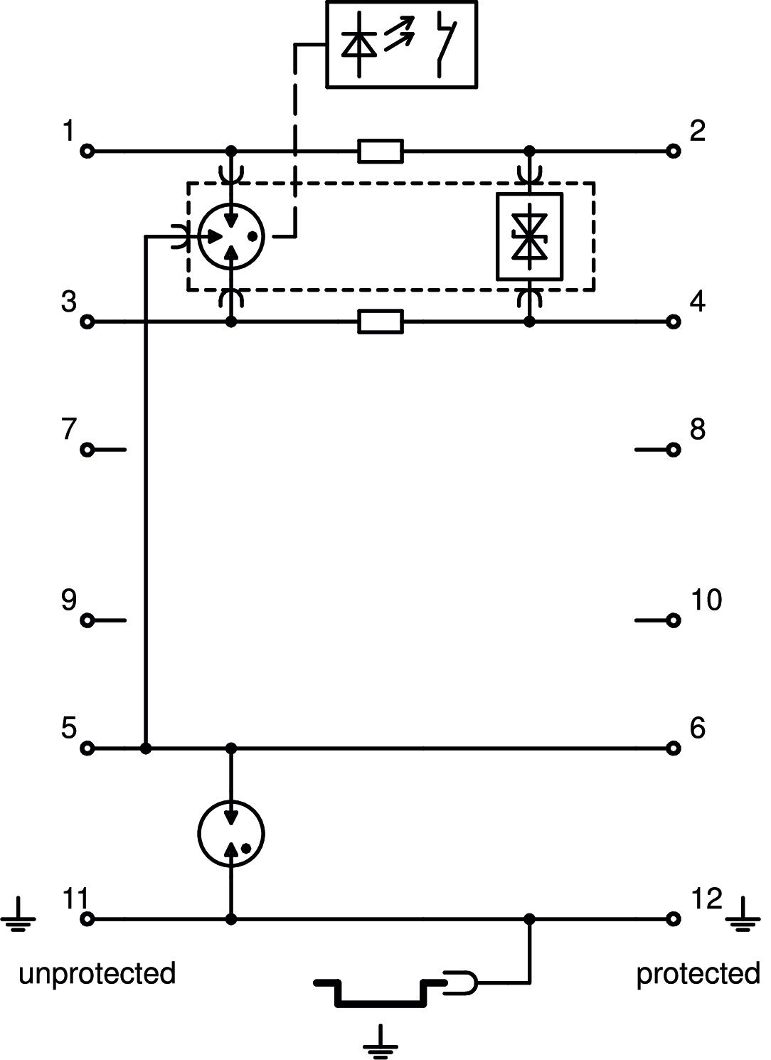 Capacity (wire-earth) ≤30 pF Capacity (wire-wire) ≤30 pF CO2 Footprint (GWP) Cradle-to-Gate 0,6488 kg CO2e / 1 Piece Connection cross-section, flexible, max. 1,5 mm² Connection cross-section, flexible, min. 0,14 mm² Connection cross-section, multi-wire, max. 2,5 mm² Connection cross-section, multi-wire, min. 0,14 mm² Connection cross-section, rigid, max. 2,5 mm² Connection cross-section, rigid, min. 0,14 mm² Cut-off frequency 100 MHz Dimension 12V Earthing via: Connection cable / DIN rail Height 95 mm Impulse durability wire-earth 10 kV / 5 kA Impulse durability wire-wire 10 kV / 5 kA Insertion loss ≤3 dB Kategorie Type 1+2 / D1+C2 Length 75 mm Lengthwise resistance 1.2 ± 5% Lightning impulse current 2,5 kA Lightning protection zone LPZ 0→2 Maximum continuous voltage AC 12 V Maximum continuous voltage DC 16 V Mounting of input / output Screw terminals Nominal discharge current (8/20 µs) 10 kA Nominal load current AC 0,425 A Nominal load current DC 0,6 A Number of poles 4 Permitted temperature range, max. 80 °C Permitted temperature range, min. -40 °C Plug-in system Terminal Protection level wire-earth 1600 V Protection level wire-wire 130 V Protection level, shield-earth (S-PE) 1300 V Protection rating IP20 Screening Indirect Series resistance per wire 1,2 Ω ± 5% Shielding connection available yes Signalling on device None SPD to EN 61643-11 Type 1+2 SPD to IEC 61643-1 Class I+II SPD to IEC 61643-21 Class I+II / D1+C2 Testing standard IEC 61643-21 Total discharge current (10/350) 2,5 kA Total discharge current (8/20) 20 kA Total impulse durability into C2 (8/20) 20 kA Version for 2x2-pole Width 17,5 mm - All types