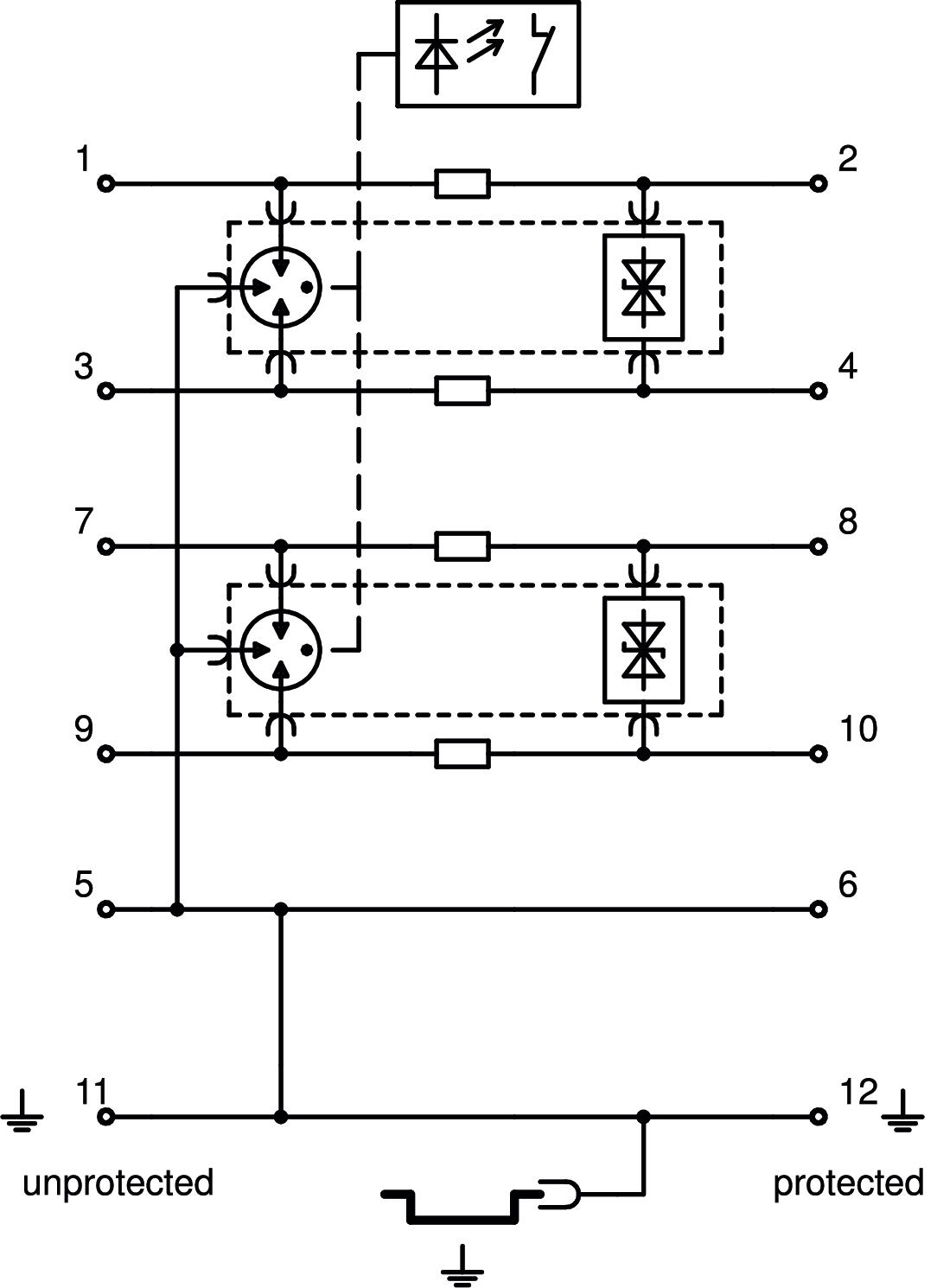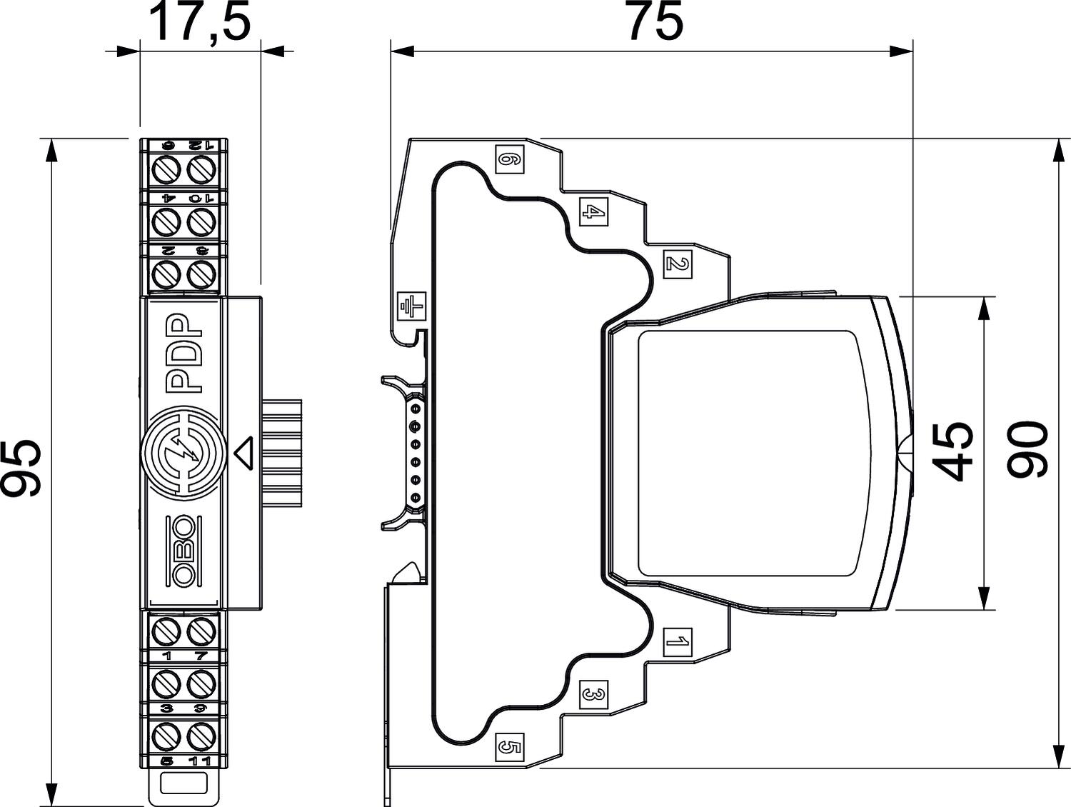 Capacity (wire-earth) ≤30 pF Capacity (wire-wire) ≤30 pF CO2 Footprint (GWP) Cradle-to-Gate 0,7765 kg CO2e / 1 Piece Connection cross-section, flexible, max. 1,5 mm² Connection cross-section, flexible, min. 0,14 mm² Connection cross-section, multi-wire, max. 2,5 mm² Connection cross-section, multi-wire, min. 0,14 mm² Connection cross-section, rigid, max. 2,5 mm² Connection cross-section, rigid, min. 0,14 mm² Cut-off frequency 100 MHz Dimension 24V Earthing via: Connection cable / DIN rail Height 95 mm Impulse durability wire-earth 10 kV / 5 kA Impulse durability wire-wire 10 kV / 5 kA Insertion loss ≤3 dB Kategorie Type 1+2 / D1+C2 Length 75 mm Lengthwise resistance 1.2 ± 5% Lightning impulse current 2,5 kA Lightning protection zone LPZ 0→2 Maximum continuous voltage AC 21 V Maximum continuous voltage DC 30 V Mounting of input / output Screw terminals Nominal discharge current (8/20 µs) 10 kA Nominal load current AC 0,425 A Nominal load current DC 0,6 A Number of poles 4 Permitted temperature range, max. 80 °C Permitted temperature range, min. -40 °C Plug-in system Terminal Protection level wire-earth 850 V Protection level wire-wire 150 V Protection rating IP20 Screening Direct Series resistance per wire 1,2 Ω ± 5% Shielding connection available yes Signalling on device None SPD to EN 61643-11 Type 1+2 SPD to IEC 61643-1 Class I+II SPD to IEC 61643-21 Class I+II / D1+C2 Testing standard IEC 61643-21 Total discharge current (10/350) 5 kA Total discharge current (8/20) 20 kA Total impulse durability into C2 (8/20) 20 kA Version for 2x2-pole Width 17,5 mm - All types