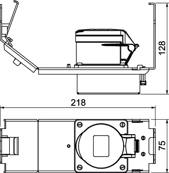 Product descriptionDevice support of nominal size 3 with a CEE plug connection 16 A for installation in service outlets and cassettes of nominal sizes R7, 9 and R9. Device support with protective housing and strain relief. Required minimum installation depth: 190 mm when using a straight connector and 160 mm when an angled connector is used.