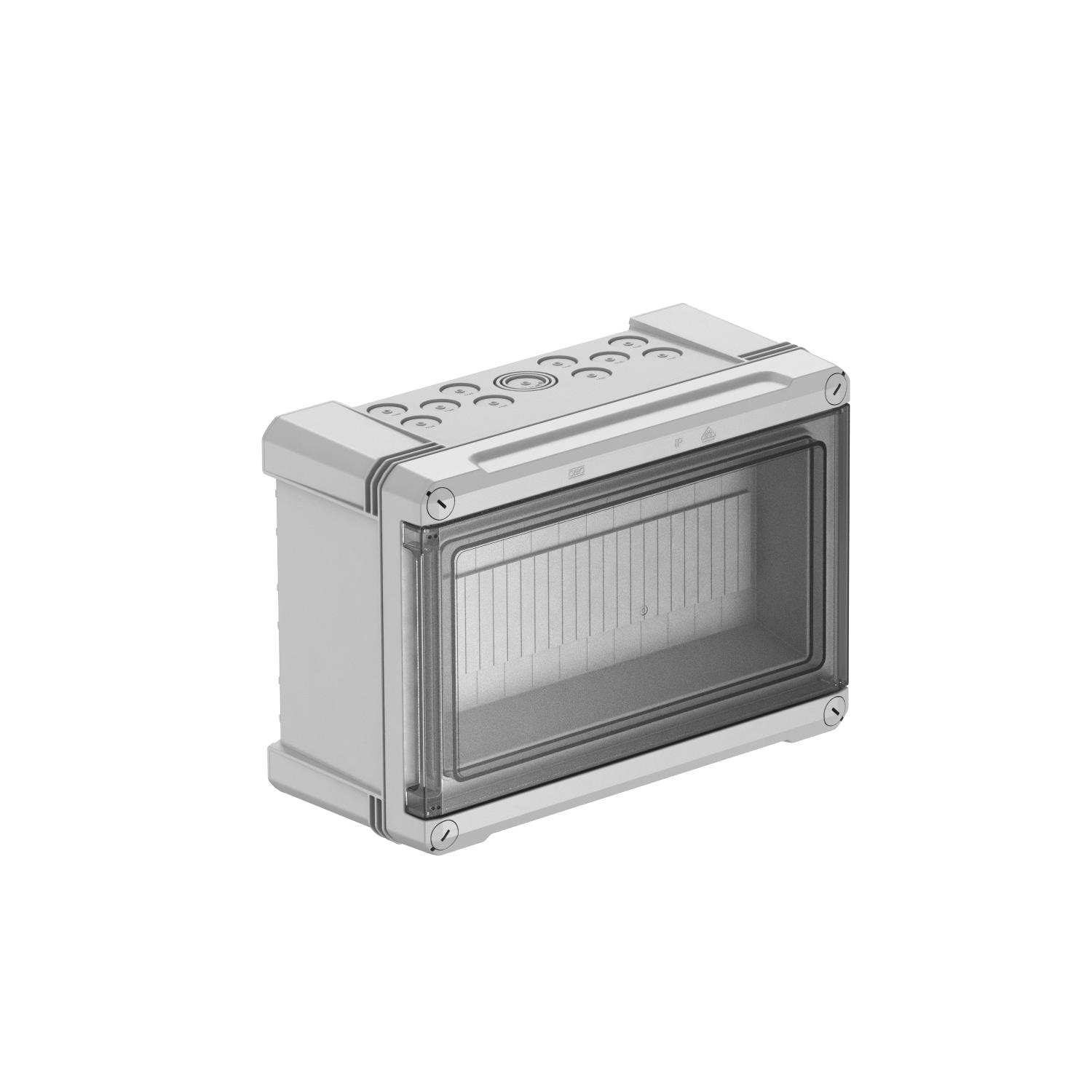 Product descriptionSmall distributor for surface mounting, for the current sub-distribution in interior and exterior areas, according to IEC 439-3. With pre-mounted 35 mm hat profile rail. IP66 protection type and IK08 protection rating. Transparent cover to screw on, with cut-out. Including 4 screw cover caps.