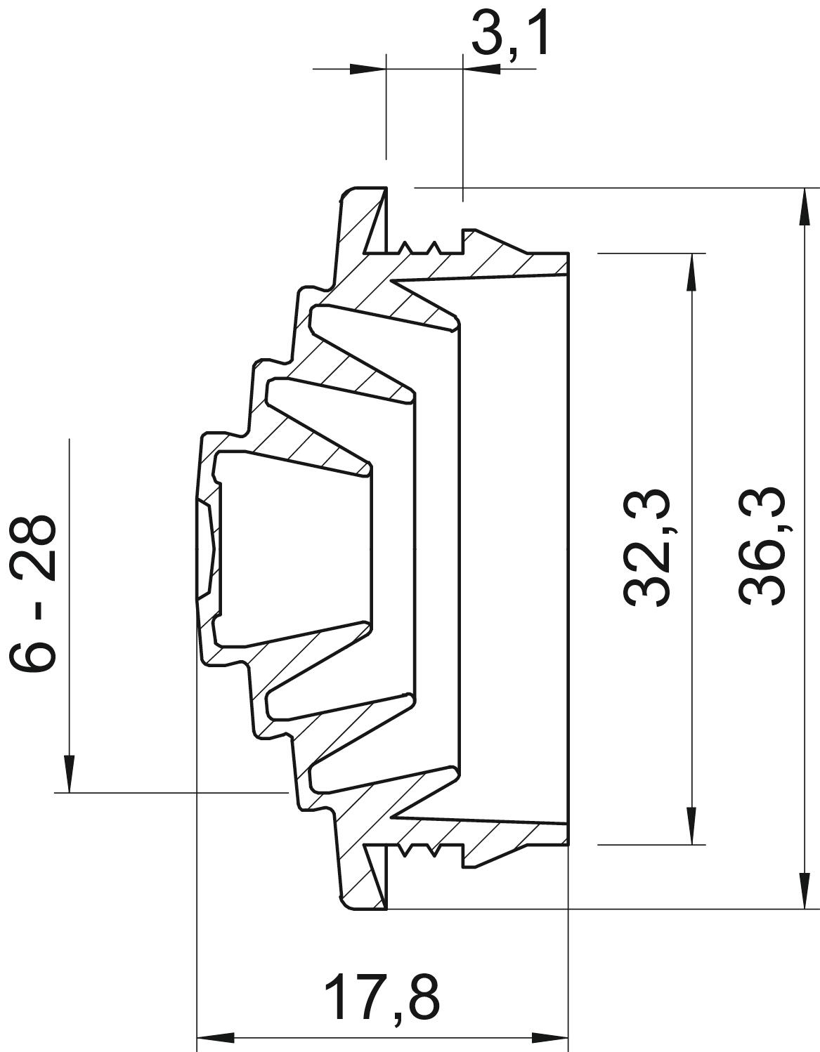CO2 Footprint (GWP) Cradle-to-Gate 0,0142 kg CO2e / 1 Piece Colour Light grey; RAL 7035 Dimension M32 Dimension A 3,1 mm Dimension D1 36,3 mm Dimension D2 32,3 mm Dimension D3 6 mm Dimension D4 10 mm Dimension D5 15 mm Dimension L 17,8 mm Dimension t 3,1 mm Flame-resistant acc. to VDE 0471/DIN 695 Part 2-1, test temperature 650°C for diameter, max. 28 mm for wall thickness, max. 3,1 for wall thickness, min. 2,5 Halogen-free yes Material Thermoplastic elastomer Nominal diameter 32 mm Protection rating IP54 Size M32 Version for Cuttable - All types