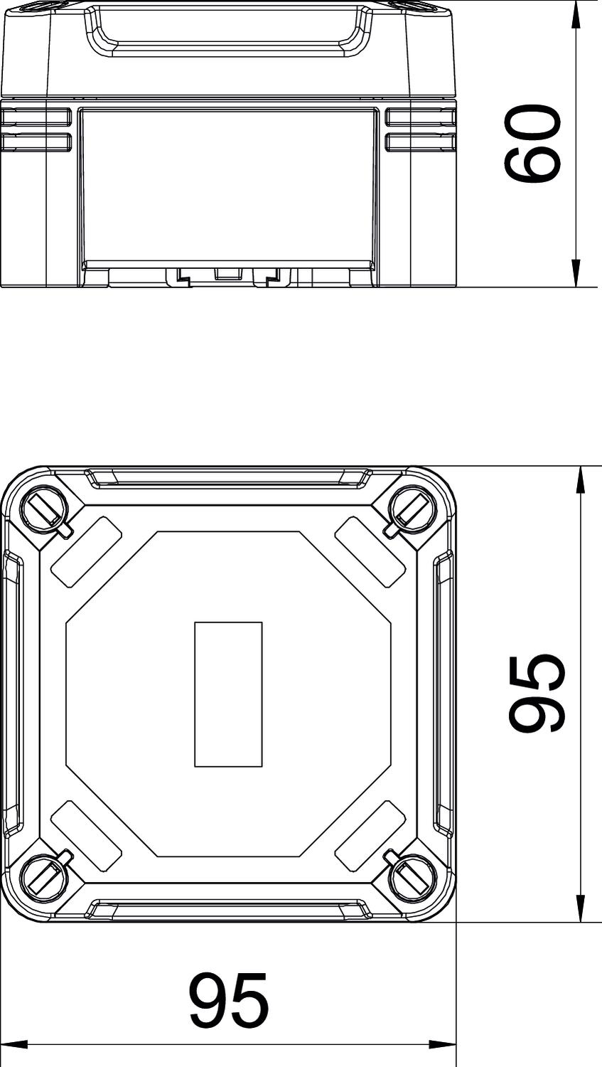 Clear internal dimensions 85x85x45 mm CO2 Footprint (GWP) Cradle-to-Gate 0,6661 kg CO2e / 1 Piece Colour Graphite black; RAL 9011 Cover fastening Screwed Dimension 95x95x60 Extension option no Height 60 mm Length 95 mm Material Polycarbonate Permitted temperature range, max. 60 °C Permitted temperature range, min. -5 °C Protection rating IP67 Protection rating IK code IK09 Shape Square Suitable for outdoor use yes Weatherproof yes Width 95 mm with lid yes - All types