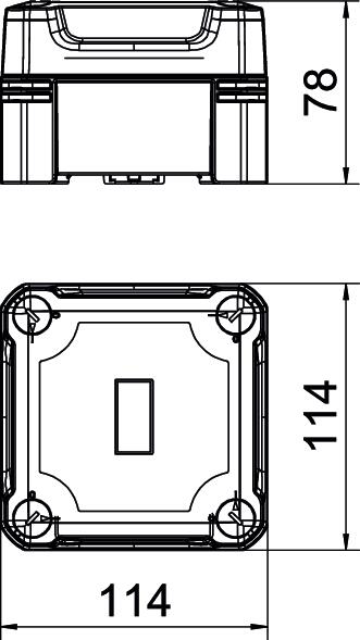 Clear internal dimensions 102x102x60 mm CO2 Footprint (GWP) Cradle-to-Gate 1,0409 kg CO2e / 1 Piece Colour Graphite black; RAL 9011 Cover fastening Screwed Dimension 114x114x78 Extension option no Height 78 mm Length 114 mm Material Polycarbonate Permitted temperature range, max. 60 °C Permitted temperature range, min. -5 °C Protection rating IP67 Protection rating IK code IK09 Shape Square Suitable for outdoor use yes Weatherproof yes Width 114 mm with lid yes - All types