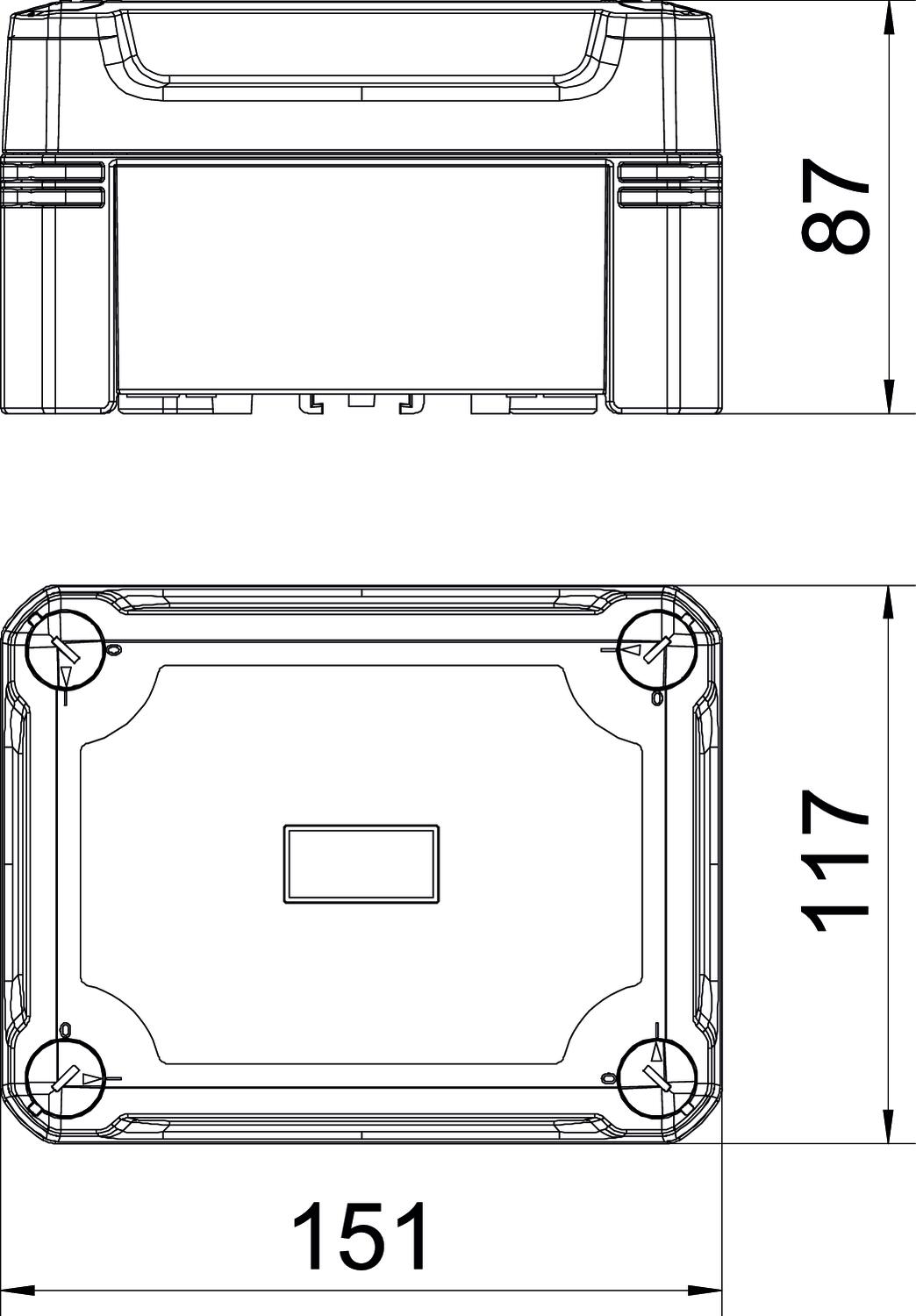 Clear internal dimensions 137x105x68 mm CO2 Footprint (GWP) Cradle-to-Gate 1,3339 kg CO2e / 1 Piece Colour Light grey; RAL 7035 Cover fastening Screwed Dimension 150x116x86 Extension option no Height 86 mm Length 151 mm Material Polycarbonate Permitted temperature range, max. 60 °C Permitted temperature range, min. -5 °C Protection rating IP67 Protection rating IK code IK09 Shape Rectangular Suitable for outdoor use yes Weatherproof yes Width 117 mm with lid yes - All types