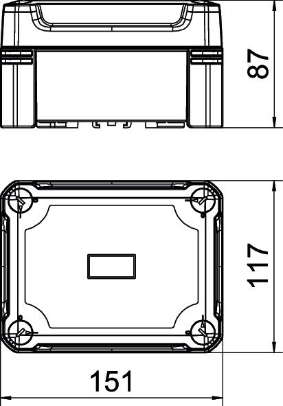 Clear internal dimensions 137x105x68 mm CO2 Footprint (GWP) Cradle-to-Gate 1,7376 kg CO2e / 1 Piece Colour Grey / transparent Cover fastening Screwed Dimension 150x116x86 Equipment Support rail Extension option no Height 86 mm Length 151 mm Material Polycarbonate Permitted temperature range, max. 60 °C Permitted temperature range, min. -5 °C Protection rating IP67 Protection rating IK code IK09 Shape Rectangular Suitable for outdoor use yes Transparent lid yes Weatherproof yes Width 117 mm with lid yes - All types