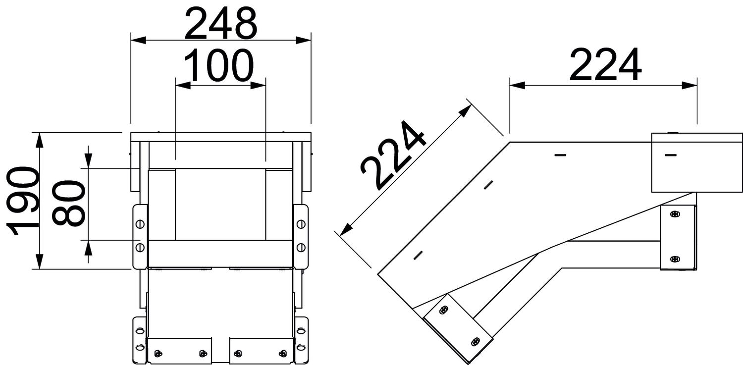 Angle of the bend 45 ° Classification EI − installation duct 90 Colour Grey Cover fastening Loose Dimension 100x80 Dimension B 248 mm Dimension b 100 mm Dimension h 80 mm Dimension H 190 mm Dimension L 224 mm Jacketing Without Material Fibreglass lightweight concrete Material of the insulation Glass-fibre lightweight concrete Number of flammable sides 4 With perforation no - All types