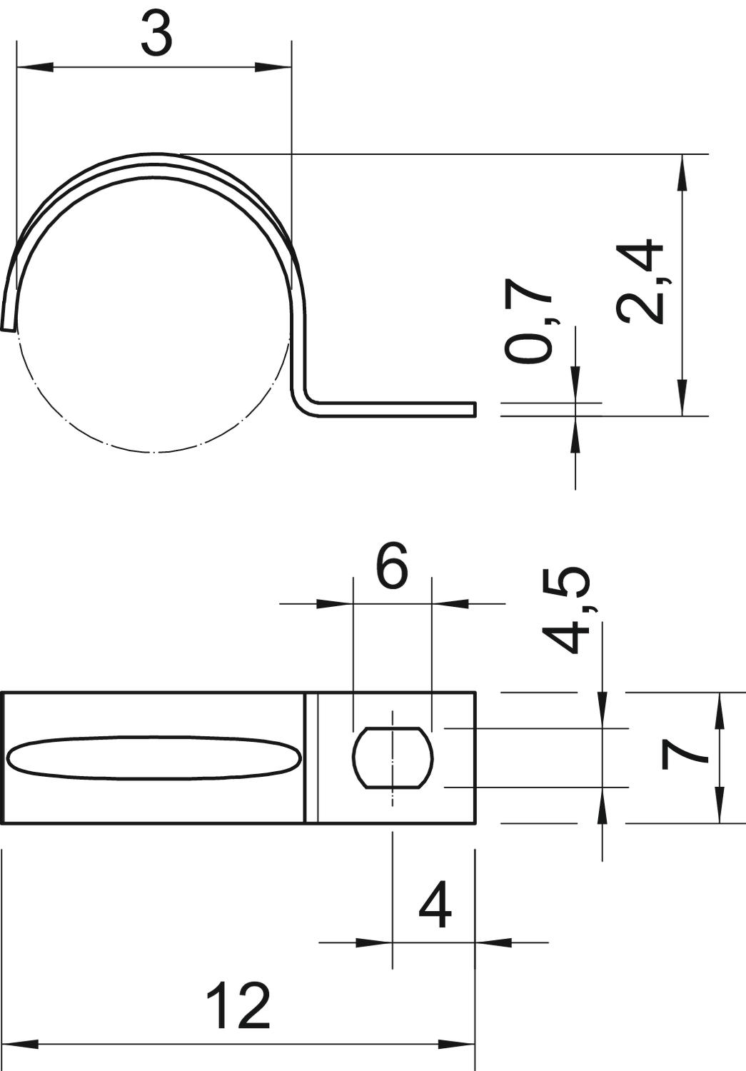 CO2 Footprint (GWP) Cradle-to-Gate 0,0023 kg CO2e / 1 Piece Dimension 3mm Dimension A 4 mm Dimension b 7 mm Dimension D 3 mm Dimension d 4,5 mm Dimension e 6 mm Dimension H 2,4 mm Dimension L 12 mm Dimension t 0,7 mm Distance to the wall no Fastening type Screw hole For diameter 3 Halogen-free yes Height 2,4 mm Hole size 4,5 x 6 mm Length 12 mm Material Steel Material thickness 0,7 mm Nominal diameter 3 mm Number of cables/pipes 1 Plastic-covered no Suitable in fire protection area no Surface Electrogalvanized UV-resistant yes Version for Single-lobe Width 7 mm - All types