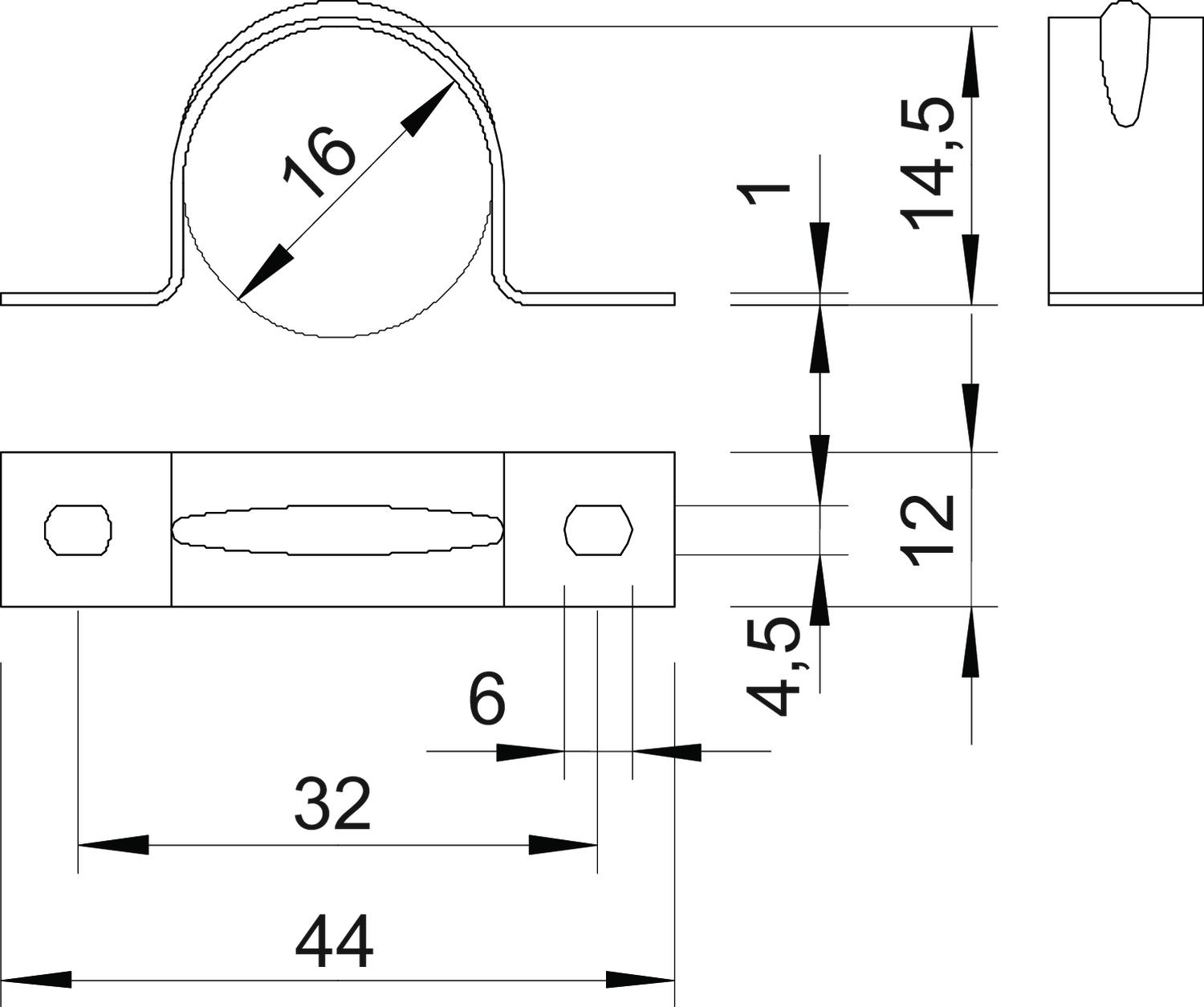 Clamping range D, max. 16 mm Clamping range D, min. 16 mm CO2 Footprint (GWP) Cradle-to-Gate 0,0371 kg CO2e / 1 Piece Dimension 16mm Dimension A 44 mm Dimension B 32 mm Dimension b 12 mm Dimension D 16 mm Dimension d 4,5 mm Dimension e 6 mm Dimension H 14,5 mm Dimension t 1 mm Distance to the wall no Fastening type Screw hole For diameter 16 Halogen-free yes Height 14,5 mm Hole size 4,5 x 6 mm Length 44 mm Material Aluminium Material thickness 1 mm Nominal diameter 16 mm Number of cables/pipes 1 Plastic-covered no Suitable in fire protection area no UV-resistant yes Version for Two-lobe Width 12 mm - All types
