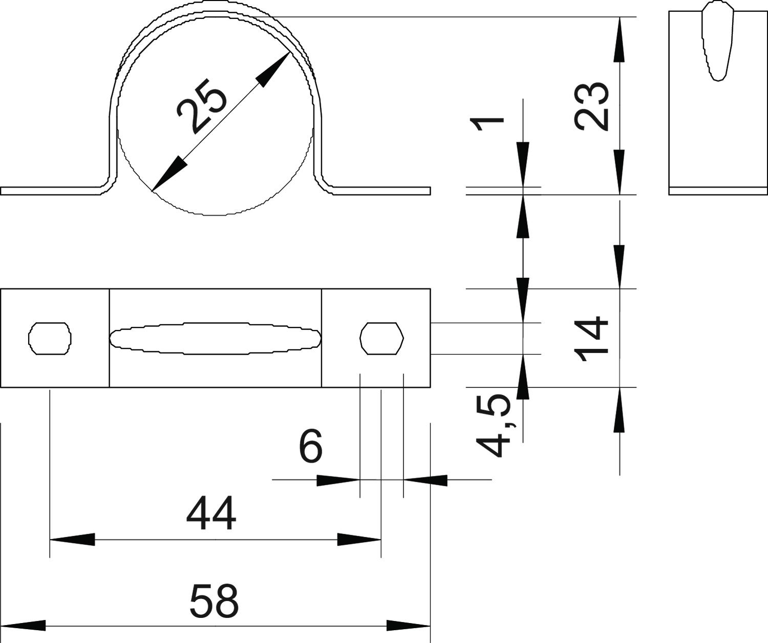 Clamping range D, max. 25 mm Clamping range D, min. 25 mm CO2 Footprint (GWP) Cradle-to-Gate 0,059 kg CO2e / 1 Piece Dimension 25mm Dimension A 58 mm Dimension B 44 mm Dimension b 14 mm Dimension d 4,5 mm Dimension D 25 mm Dimension e 6 mm Dimension H 23 mm Dimension t 1 mm Distance to the wall no Fastening type Screw hole For diameter 25 Halogen-free yes Height 23 mm Hole size 4,5 x 6 mm Length 58 mm Material Aluminium Material thickness 1 mm Nominal diameter 25 mm Number of cables/pipes 1 Plastic-covered no Suitable in fire protection area no UV-resistant yes Version for Two-lobe Width 14 mm - All types