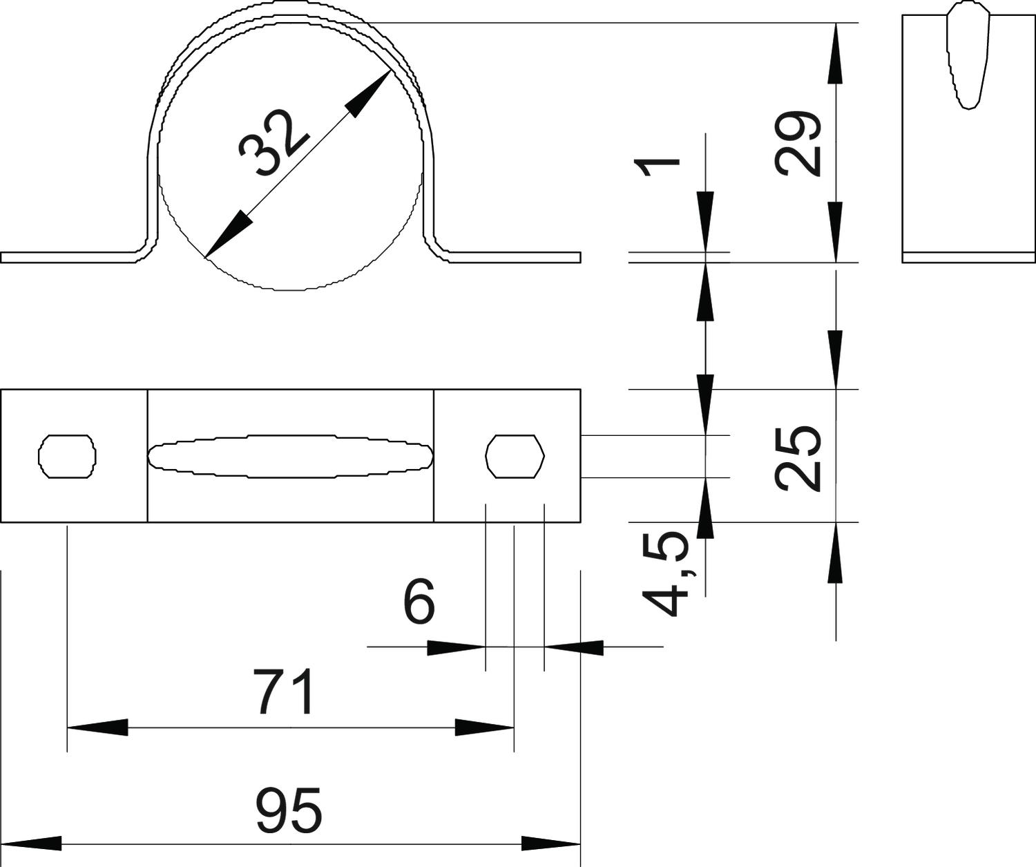 Clamping range D, max. 32 mm Clamping range D, min. 32 mm CO2 Footprint (GWP) Cradle-to-Gate 0,0724 kg CO2e / 1 Piece Dimension 32mm Dimension A 95 mm Dimension B 71 mm Dimension b 25 mm Dimension d 4,5 mm Dimension D 32 mm Dimension e 6 mm Dimension H 29 mm Dimension t 1 mm Distance to the wall no Fastening type Screw hole For diameter 32 Halogen-free yes Height 29 mm Hole size 4,5 x 6 mm Length 95 mm Material Aluminium Material thickness 1 mm Nominal diameter 32 mm Number of cables/pipes 1 Plastic-covered no Suitable in fire protection area no UV-resistant yes Version for Two-lobe Width 25 mm - All types