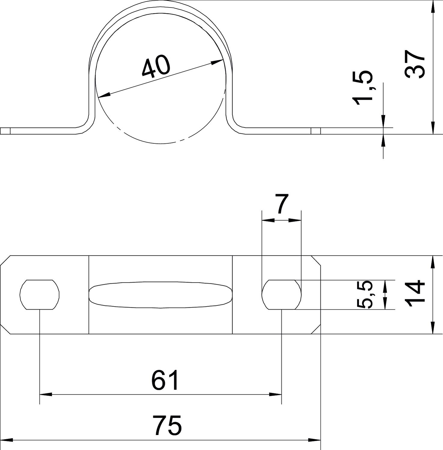 CO2 Footprint (GWP) Cradle-to-Gate 0,054 kg CO2e / 1 Piece Dimension 40mm Dimension A 75 mm Dimension B 61 mm Dimension b 14 mm Dimension d 5,5 mm Dimension D 40 mm Dimension e 7 mm Dimension H 37 mm Dimension t 1,5 mm Distance to the wall no Fastening type Screw hole For diameter 40 Halogen-free yes Height 37 mm Hole size 5,5 x 7 mm Length 75 mm Material Steel Material thickness 1,5 mm Nominal diameter 40 mm Number of cables/pipes 1 Plastic-covered no Suitable in fire protection area no Surface Electrogalvanized UV-resistant yes Version for Two-lobe Width 14 mm - All types