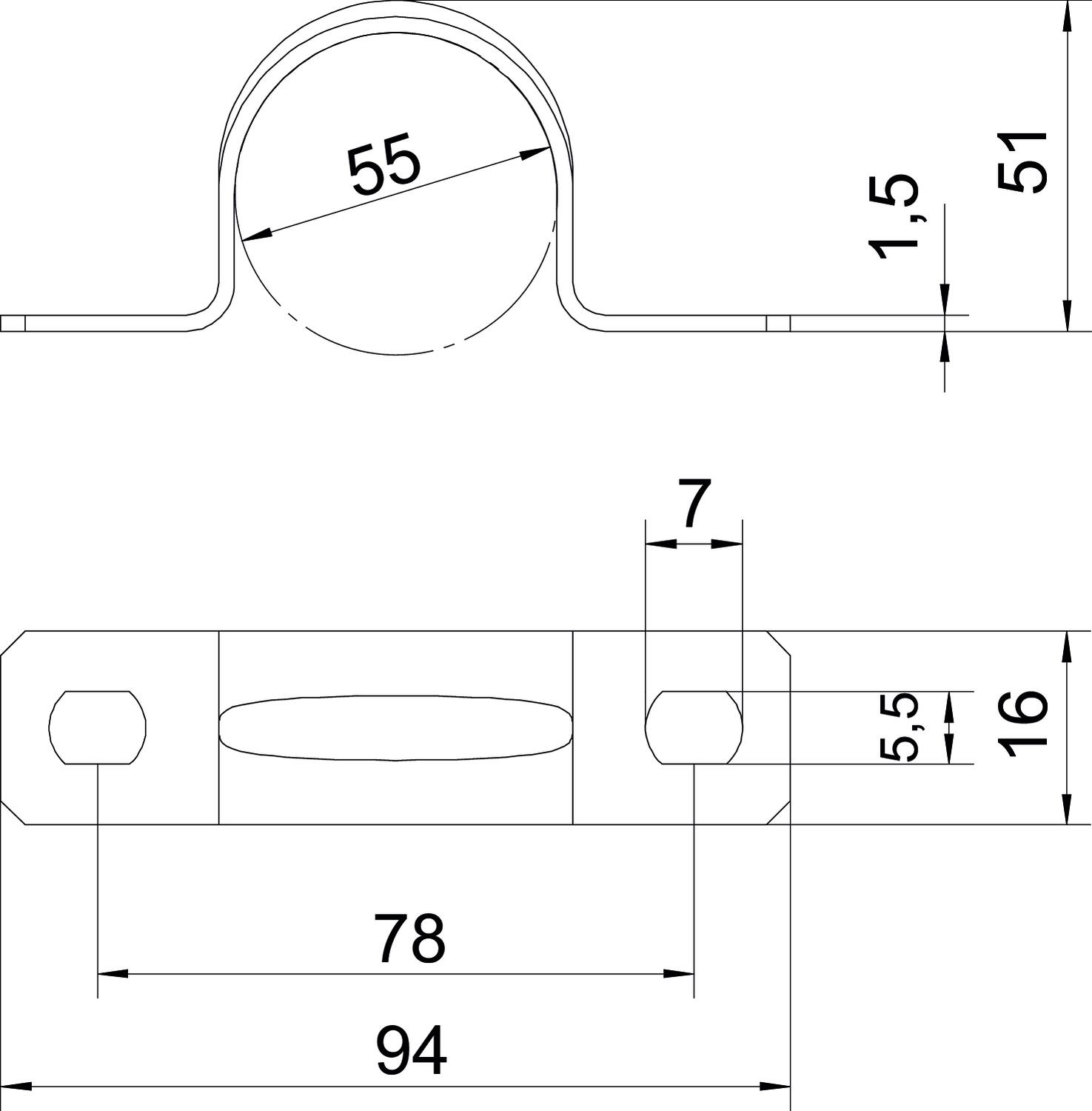 CO2 Footprint (GWP) Cradle-to-Gate 0,0816 kg CO2e / 1 Piece Dimension 55mm Dimension A 94 mm Dimension b 16 mm Dimension B 78 mm Dimension d 5,5 mm Dimension D 55 mm Dimension e 7 mm Dimension H 51 mm Dimension t 1,5 mm Distance to the wall no Fastening type Screw hole For diameter 55 Halogen-free yes Height 51 mm Hole size 5,5 x 7 mm Length 94 mm Material Steel Material thickness 1,5 mm Nominal diameter 55 mm Number of cables/pipes 1 Plastic-covered no Suitable in fire protection area no Surface Electrogalvanized UV-resistant yes Version for Two-lobe Width 16 mm - All types