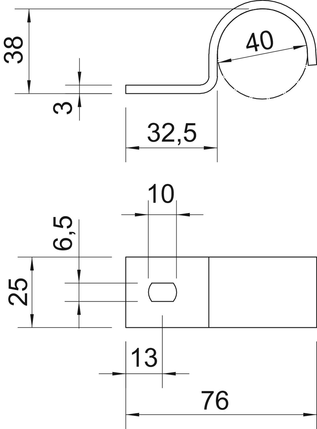 CO2 Footprint (GWP) Cradle-to-Gate 0,1853 kg CO2e / 1 Piece Dimension 40mm Dimension A 13 mm Dimension b 25 mm Dimension D 40 mm Dimension H 38 mm Dimension L 32,5 mm Dimension L1 76 mm Dimension t 3 mm Distance to the wall no Fastening type Screw hole For diameter 40 Halogen-free yes Height 38 mm Hole size 6,5 x 10 mm Length 76 mm Material Steel Material thickness 2 mm Nominal diameter 40 mm Number of cables/pipes 1 Plastic-covered no Size M40 Suitable in fire protection area no Surface Hot-dip galvanised UV-resistant yes Version for Single-lobe Width 25 mm - All types
